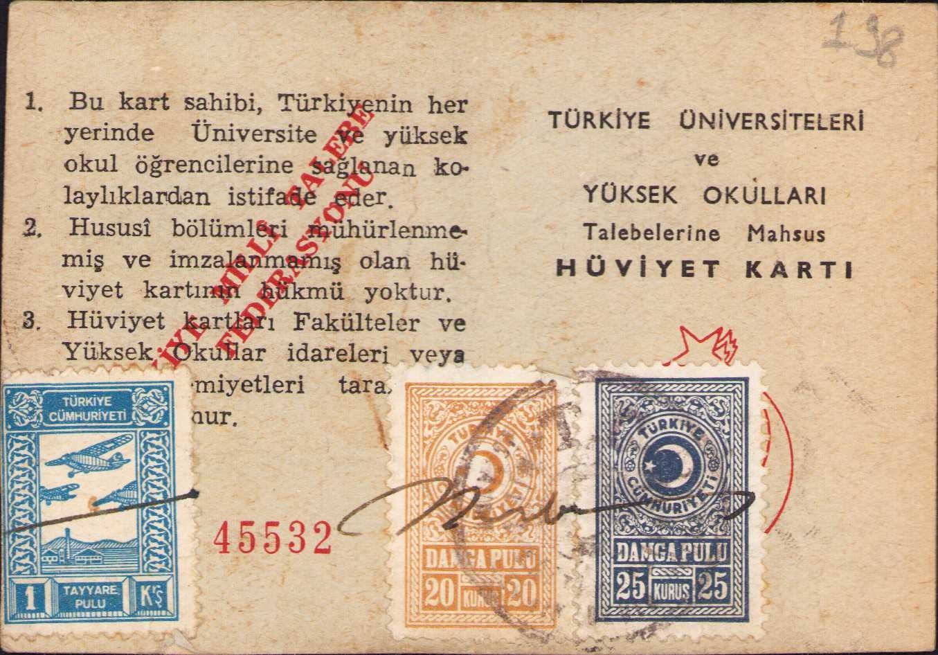 Hüviyet kartı, Türkiye üniversiteleri ve yüksek okulları talebelerine mahsus, 11x8 cm