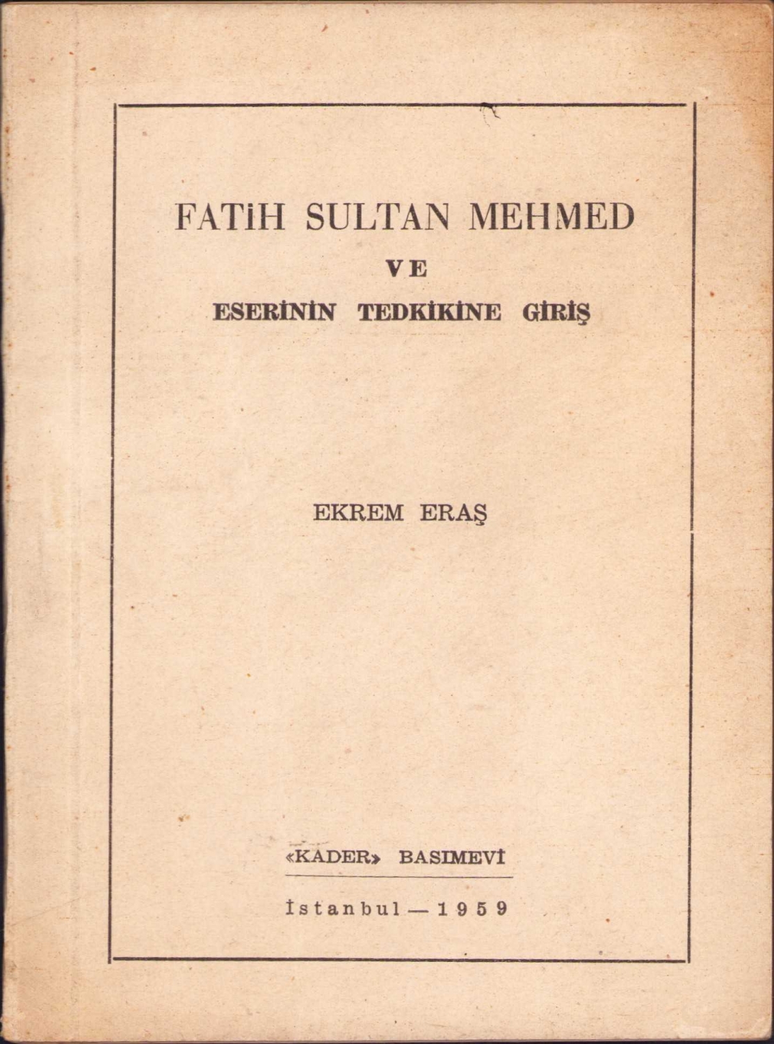 Fatih Sultan Mehmed ve Eserinin Tetkikine Giriş, Ekrem Eraş, İstanbul, 1959, 50 sayfa, 12x16 cm