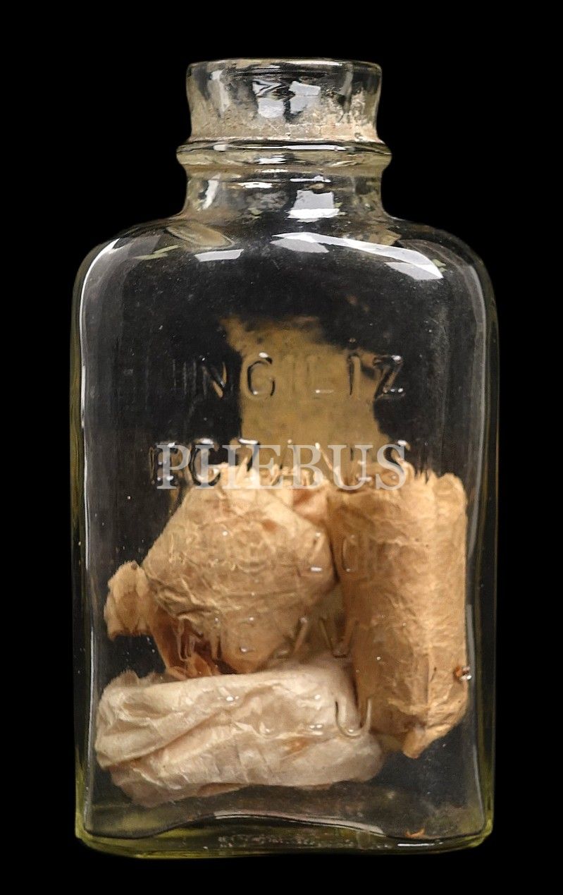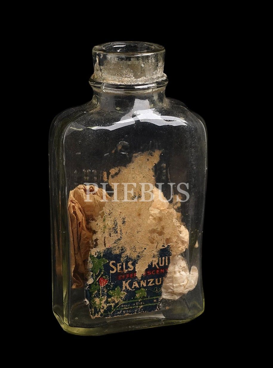 Kabartma İngiliz Eczanesi Kanzuk Meyva Tuzu yazılı ve etiketli şişe, 12x6x3 cm...