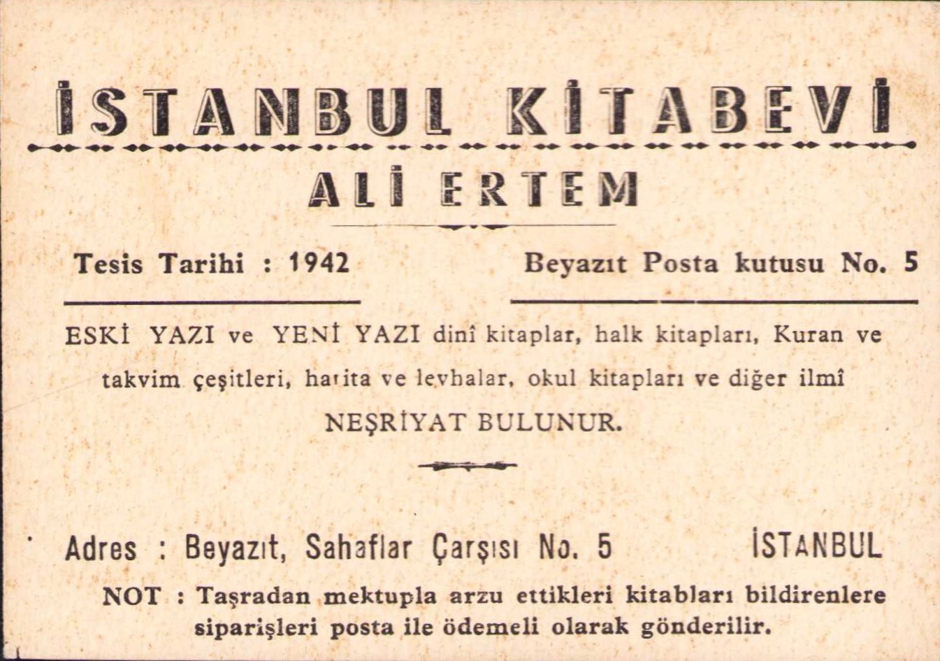 İstanbul Kitabevi kartvizit, Beyazıt Sahaflar Çarşısı