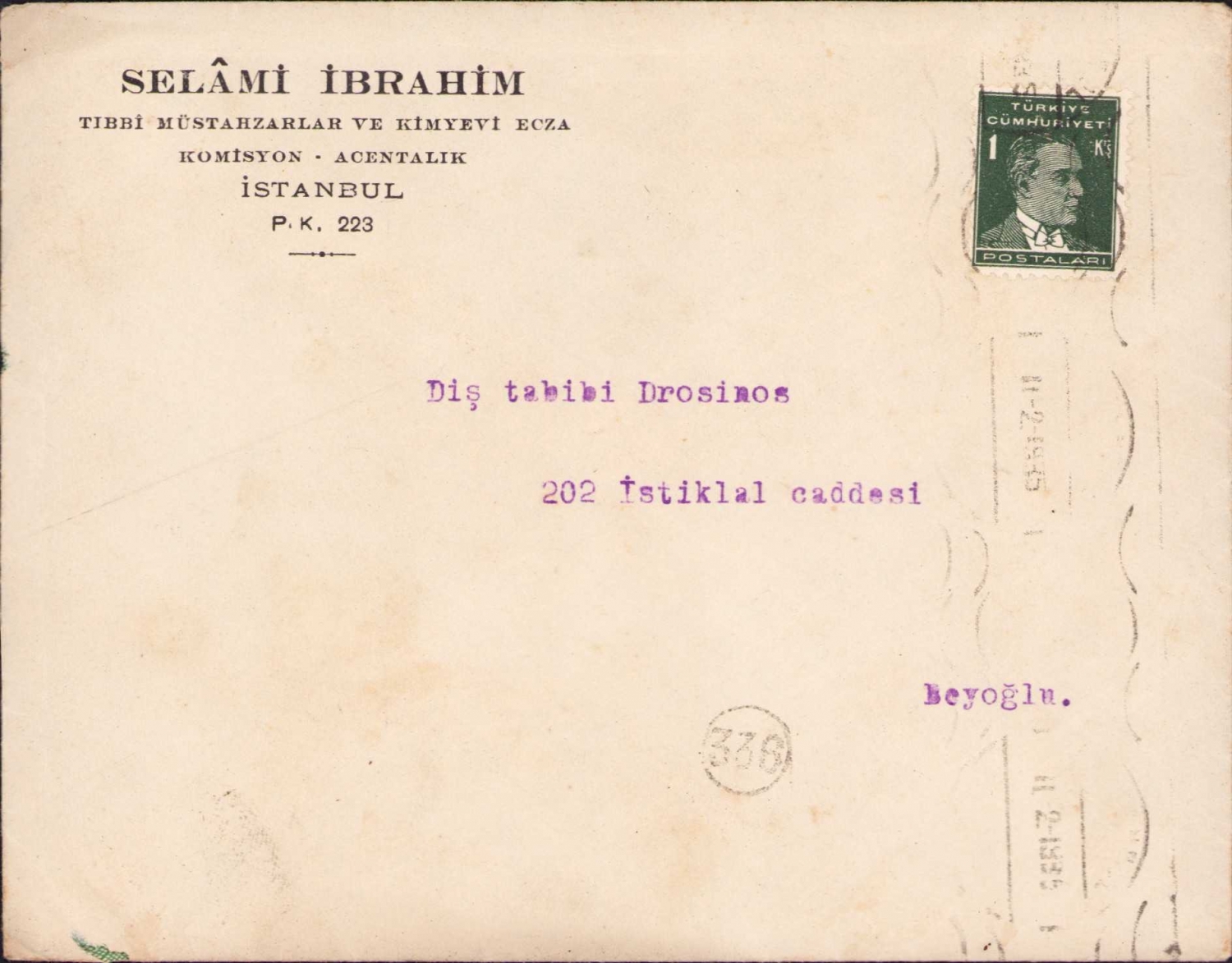 Selami İbrahim Tıbbi Müstahzarlar ve Kimyevi Ecza Komisyon - Acentelik, İstanbul antetli zarf, postadan geçmiş