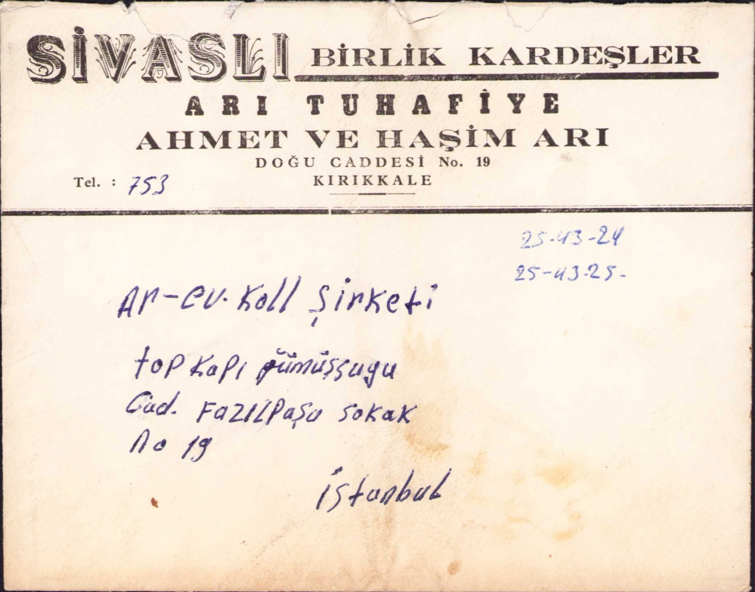 Sivaslı Birlik Kardeşler Arı Tuhafiye - Ahmet ve Haşim Arı, Kırıkkale antetli zarf