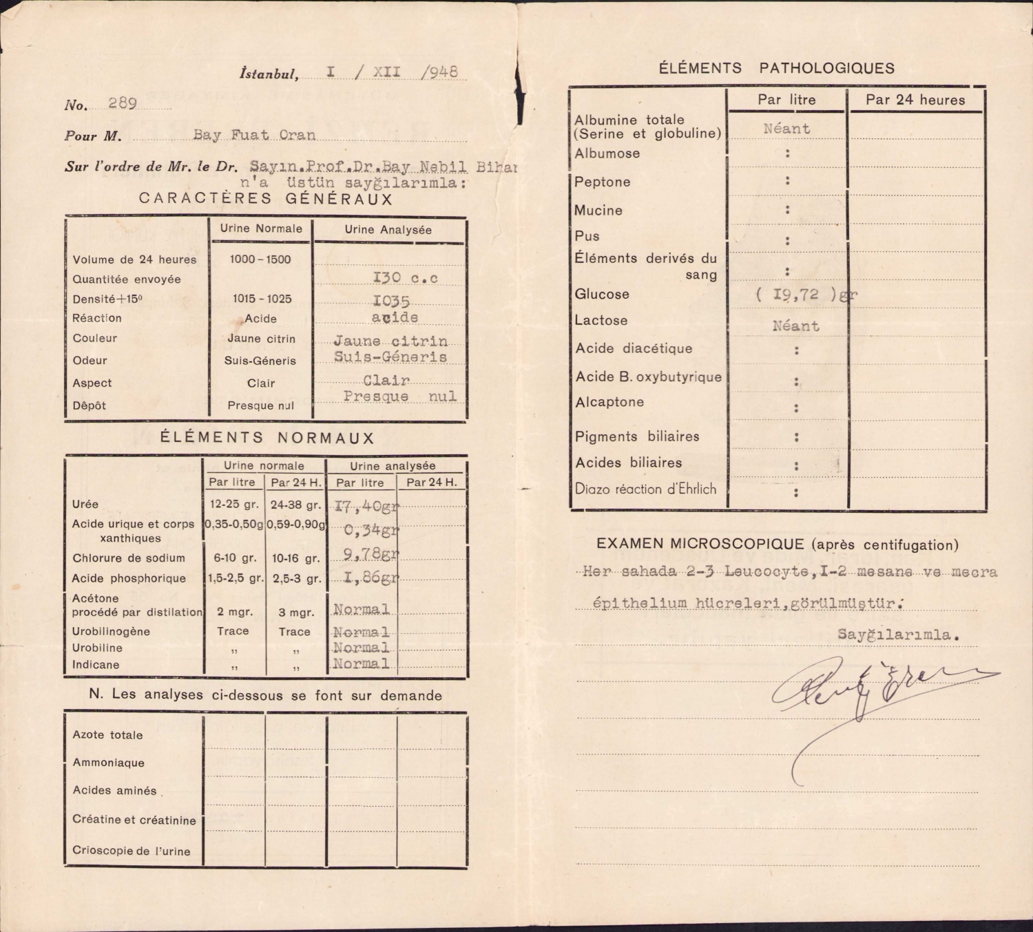 Mütehassıs Kimyager Remzi Ereren hayati ve gıda kimya tahlilleri laboratuvar sonucu, Fransızca, bir kenarı haliyle, 27x24 cm