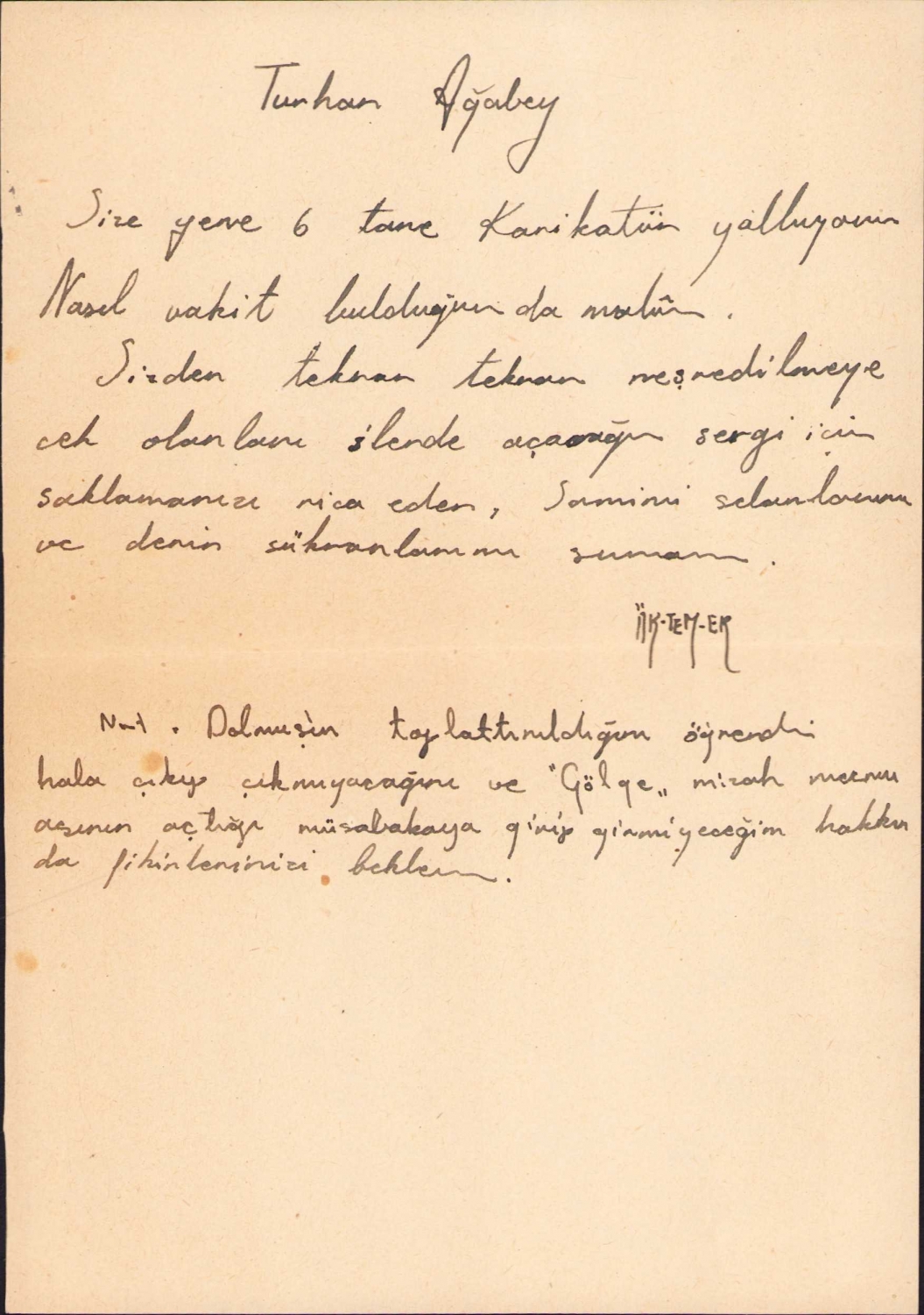 Karikatirüst Turhan Selçuk'a gönderilmiş imzalı mektup, 14x20 cm