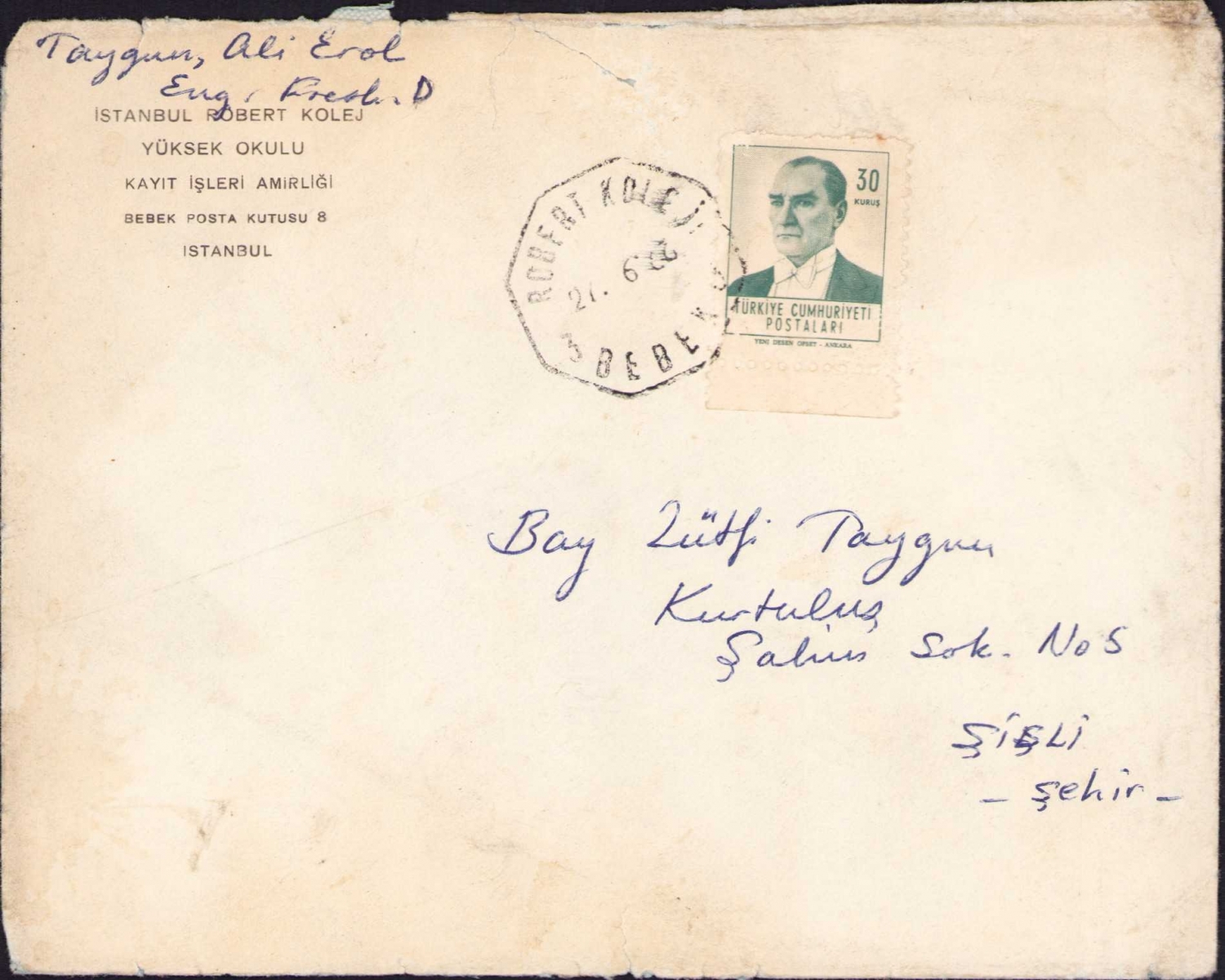 İstanbul Robert Koleji Yüksek Okulu kayıt işleri amirliği antetli postadan geçmiş zarf