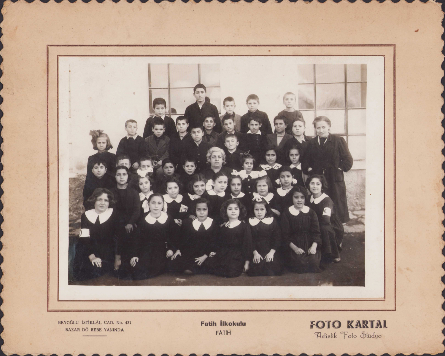 Fatih İlkokulu'nda bir sınıf öğrenci öğretmenleriyle toplu fotoğraf, Foto Kartal Stüdyosu, 25 x 19 cm