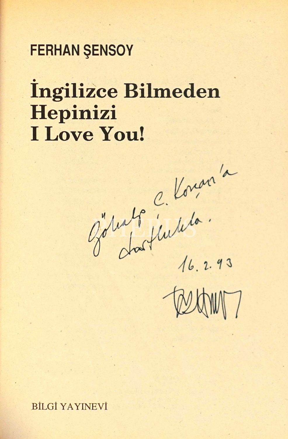 İNGİLİZCE BİLMEDEN HEPİNİZ I LOVE YOU!, Ferhan Şensoy, 1992, Bilgi Yayınevi, 175 sayfa, 14x20 cm, İTHAFLI ve İMZALI...
