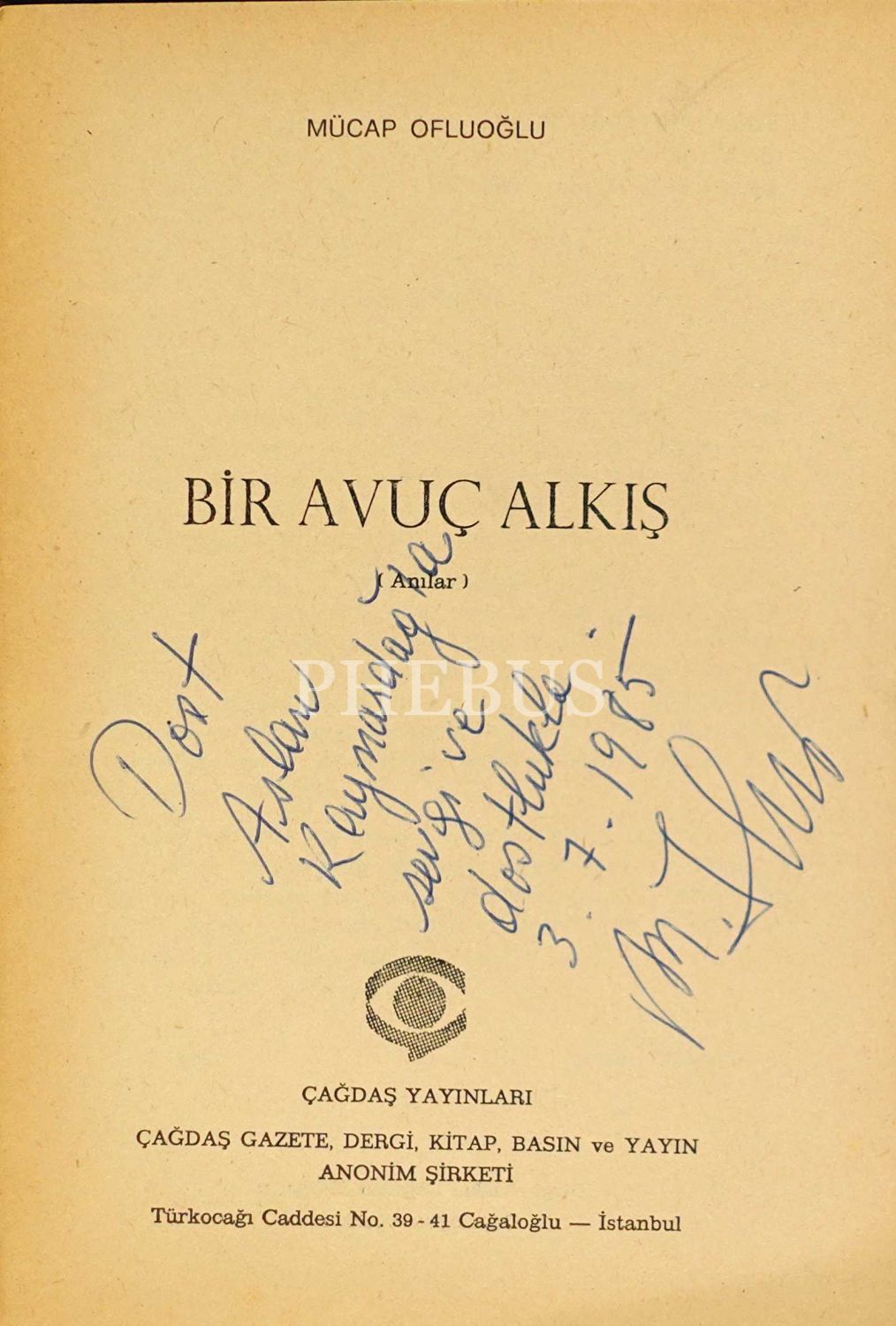 İthaf, "Dost Aslan Kaymazdağ´a sevgi ve fostlukla. 3.7.1985" şeklindedir.