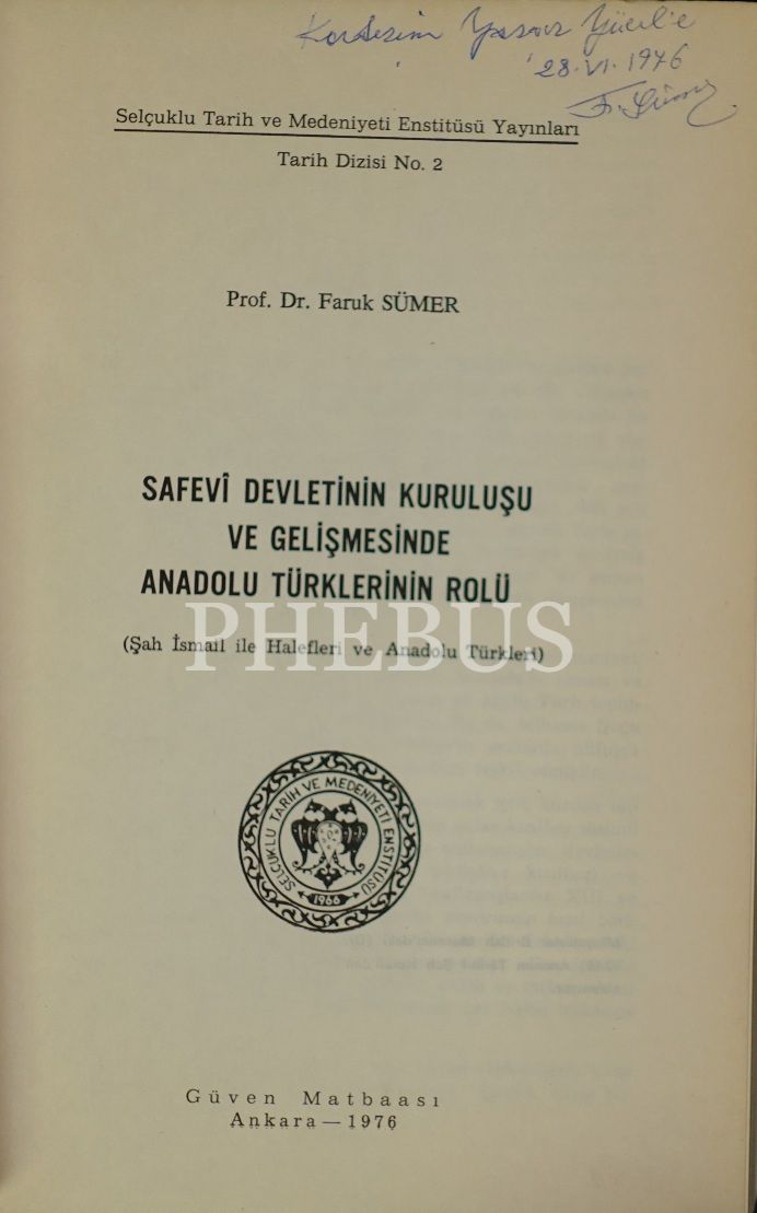 SAFEVÎ DEVLETİNİN KURULUŞU VE GELİŞMESİNDE ANADOLU TÜRKLERİNİN ROLÜ, Faruk Sümer, 1976, Selçuklu Tarihi ve Medeniyeti Enstitüsü Yayınları, 265 sayfa, 17x24 cm, İTHAFLI ve İMZALI...