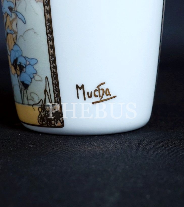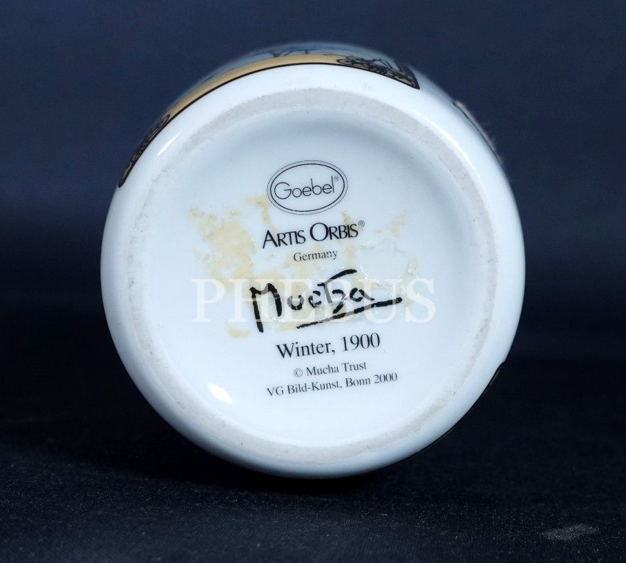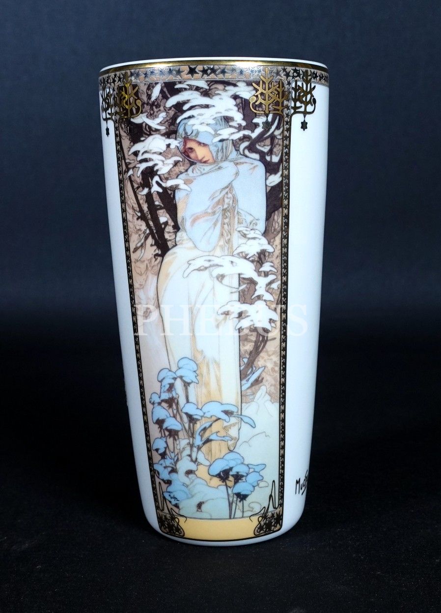 Alman malı Goebel ´´Artıs Orbis´´ marka dijital baskı, kadın figürü ve desenlerle bezeli porselen ´´MUCHA´´ vazo, 21 cm yükseklik, 7 cm çap...