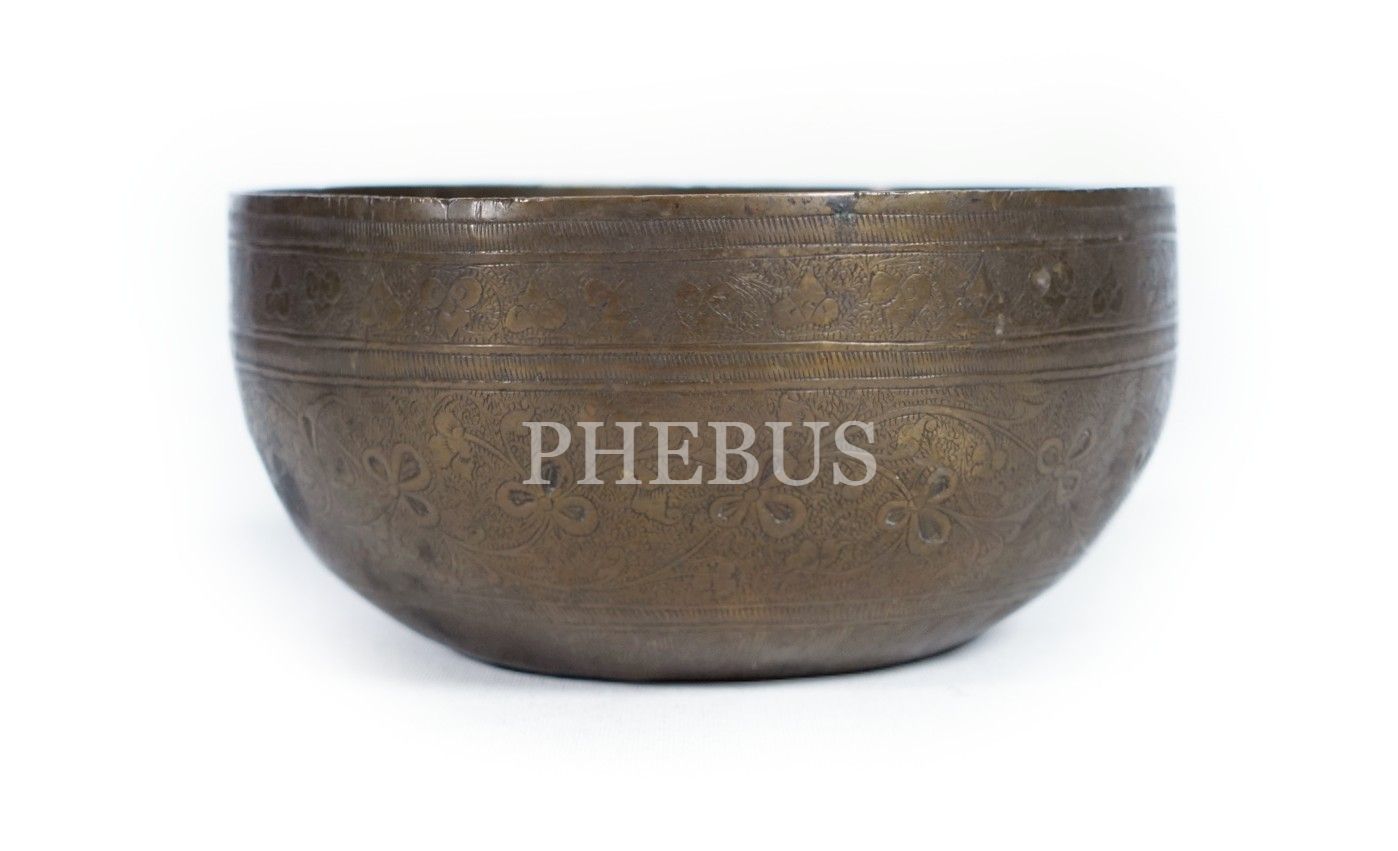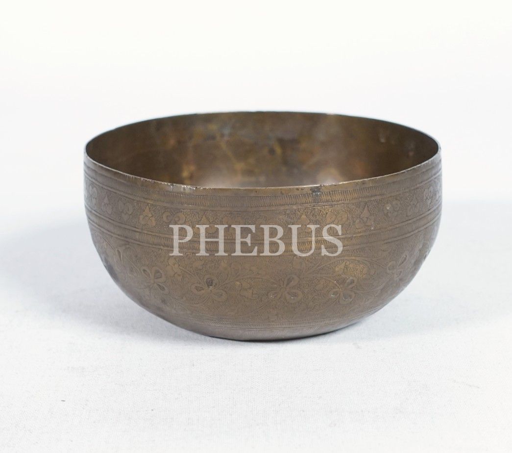 Üzeri kalem işçilikli floral desenler ile bezeli bakır çamçak, yükseklik 6 cm, çap 12 cm...