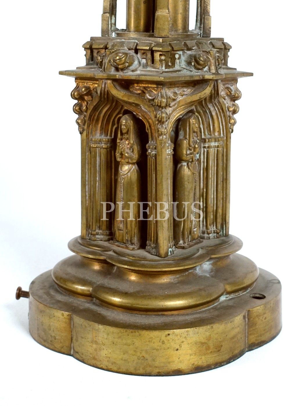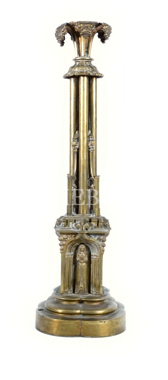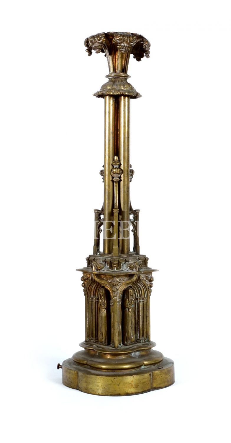 Sütunlar, rahibe figürleri ve bitkisel motiflerle bezeli gotik şamdan, Avrupa imalatı, bronz, 54x16 cm...
