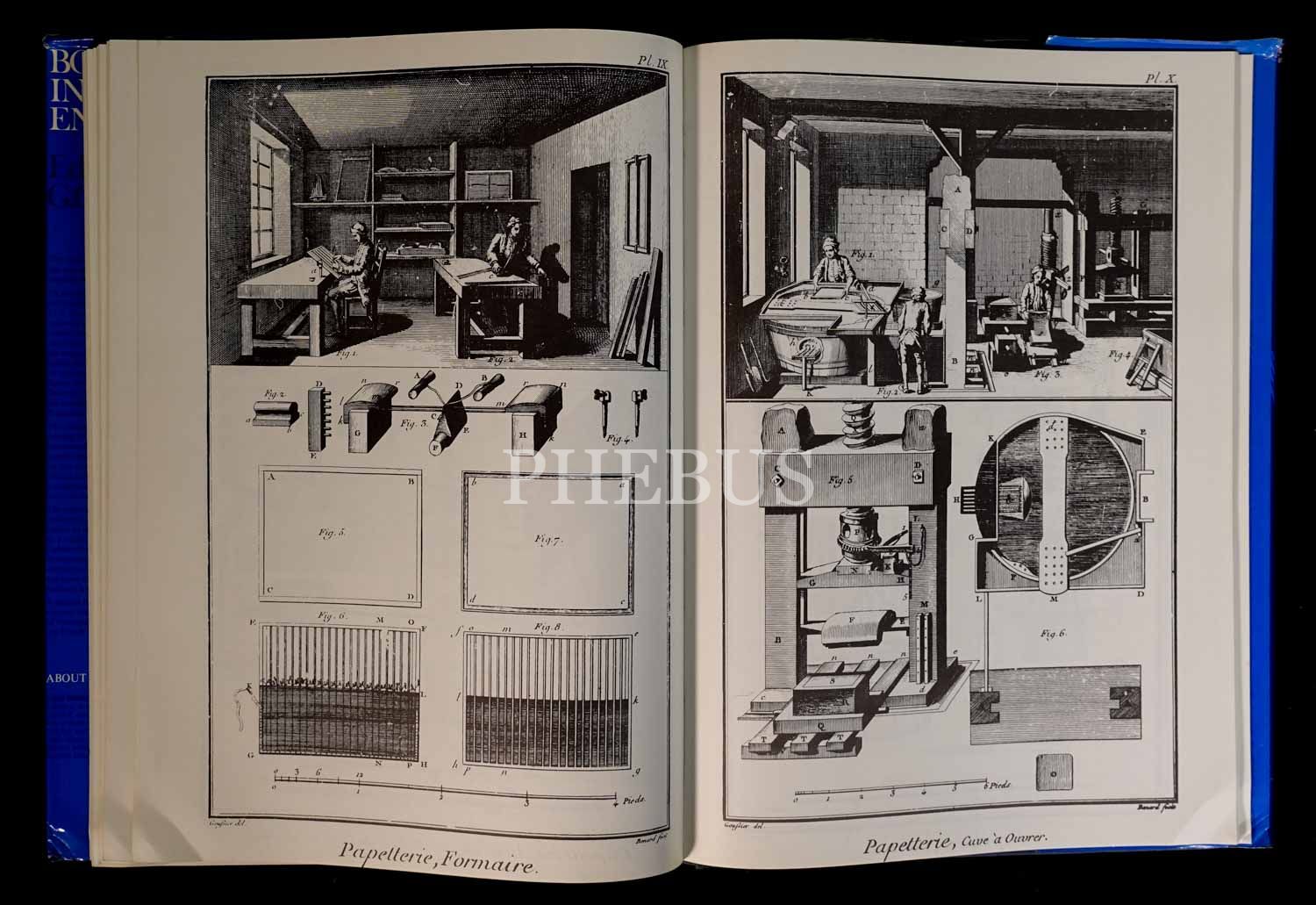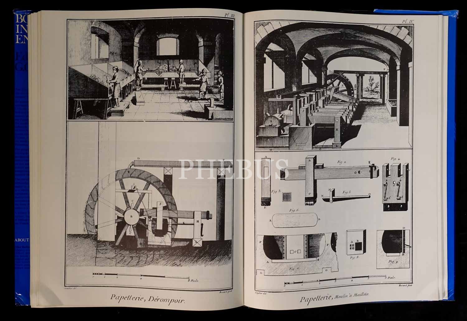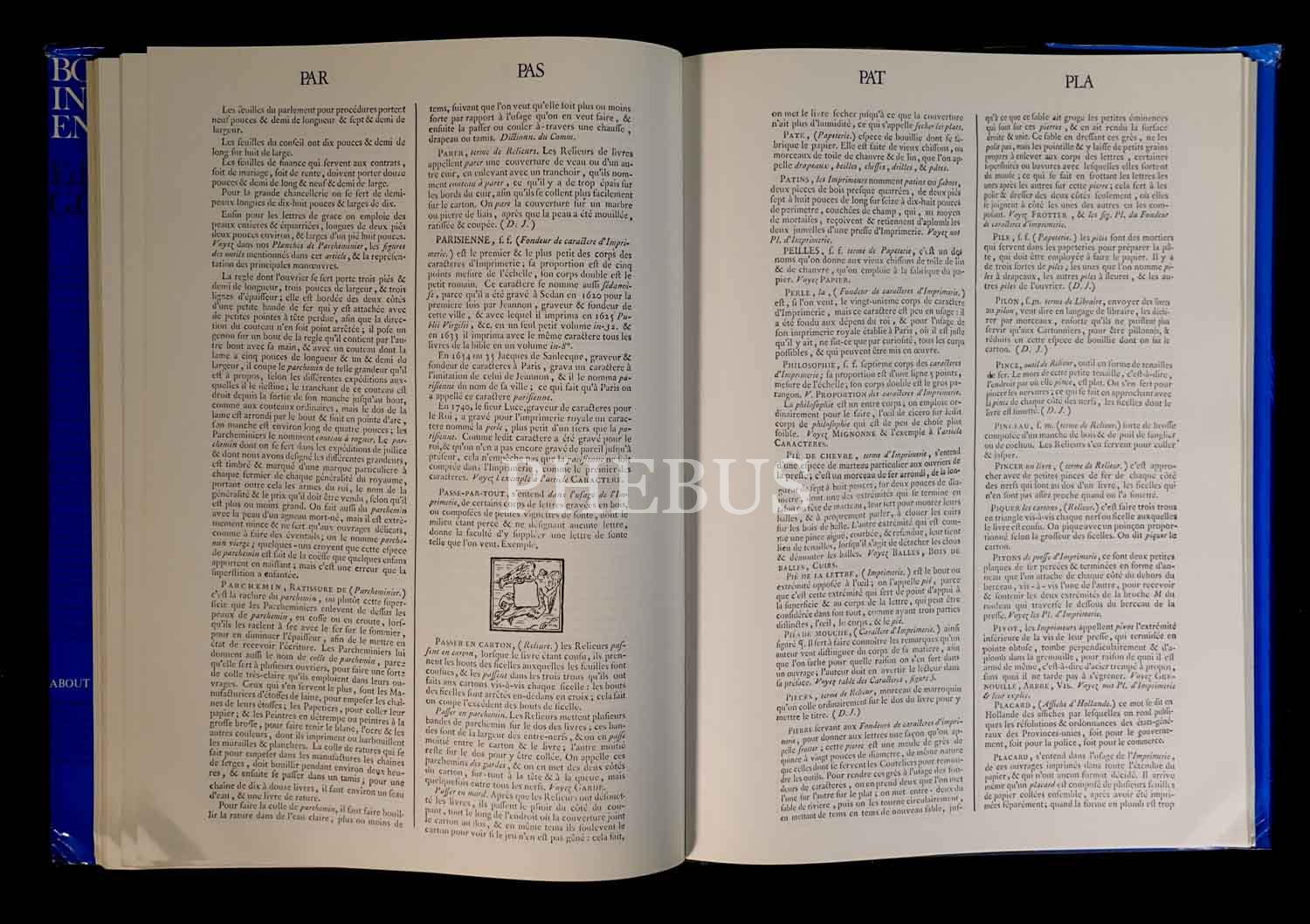 Denis Diderot´un 35. cildin sonuna dek editörlüğünü üstlendiği ünlür "Ansiklopedi"nin kitap yapımıyla ilgili bölümünün, gravürleriyle birlikte tıpkı basımı... Yayıncısının orijinal, şömizli bez cildinde. Şömiz kenarları hafif yıpranmış.