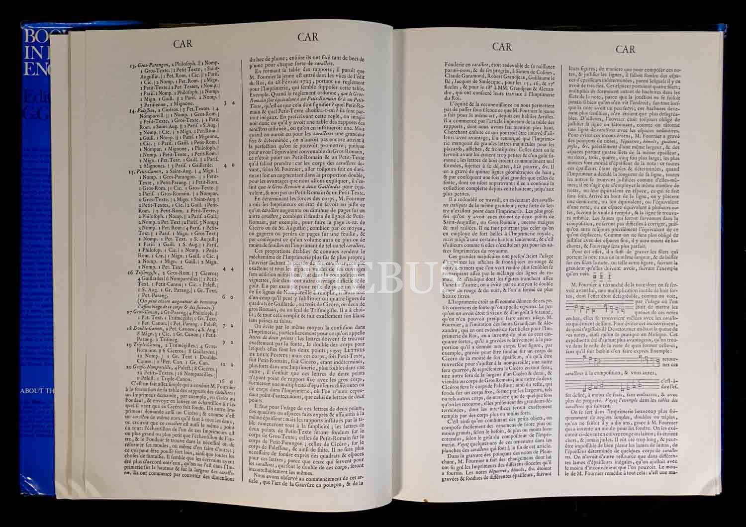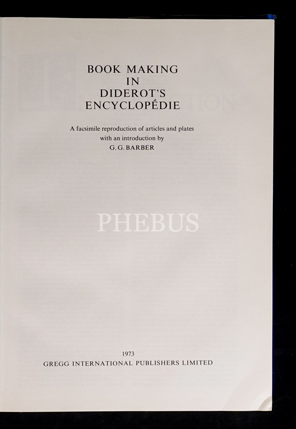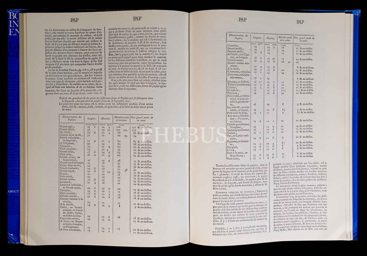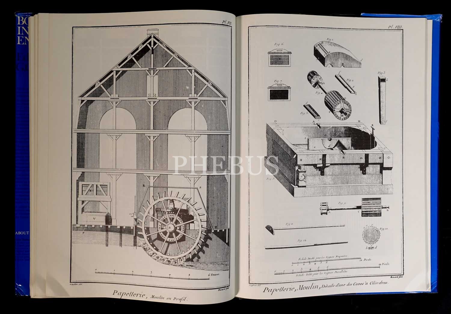 Denis Diderot´un 35. cildin sonuna dek editörlüğünü üstlendiği ünlür "Ansiklopedi"nin kitap yapımıyla ilgili bölümünün, gravürleriyle birlikte tıpkı basımı... Yayıncısının orijinal, şömizli bez cildinde. Şömiz kenarları hafif yıpranmış.