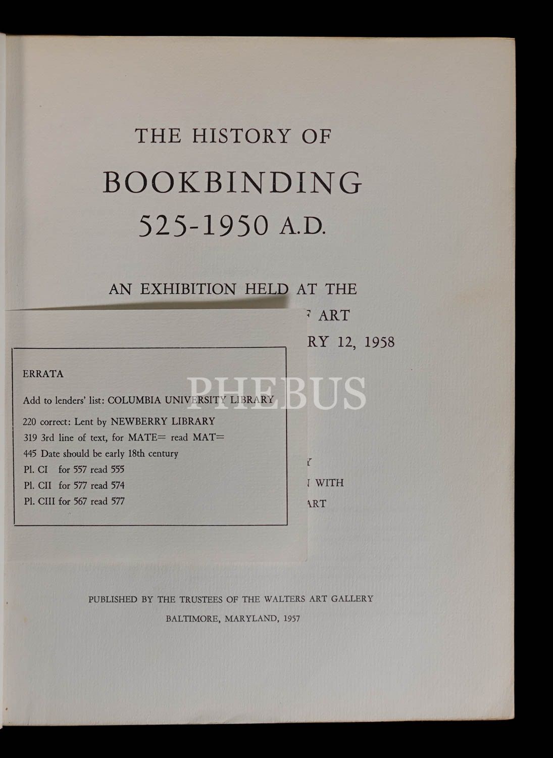 12 Kasım 1957-12 Ocak 1958 tarihleri arasında Baltimore Müzesi´nde düzenlenen "Cildin Tarihi (M. S. 525-1950)" adlı serginin, çok sayıda görselle zenginleştirilmiş, İngilizce kataloğu: THE HISTORY OF BOOKBINDING, 1957, 275 sayfa metin + görseller, 22x28 cm...