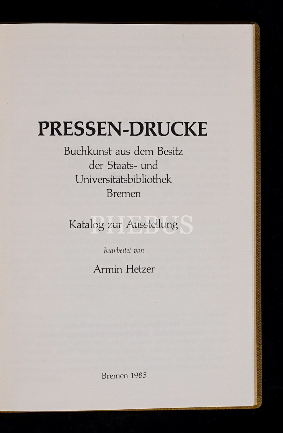 Bremen eyaleti ve üniversitesi bünyesinde yer alan "kitap sanatı" kataloğu: PRESSEN-DRUCKE, Armin Hetzer, 1985, 60 sayfa, 15x21 cm...