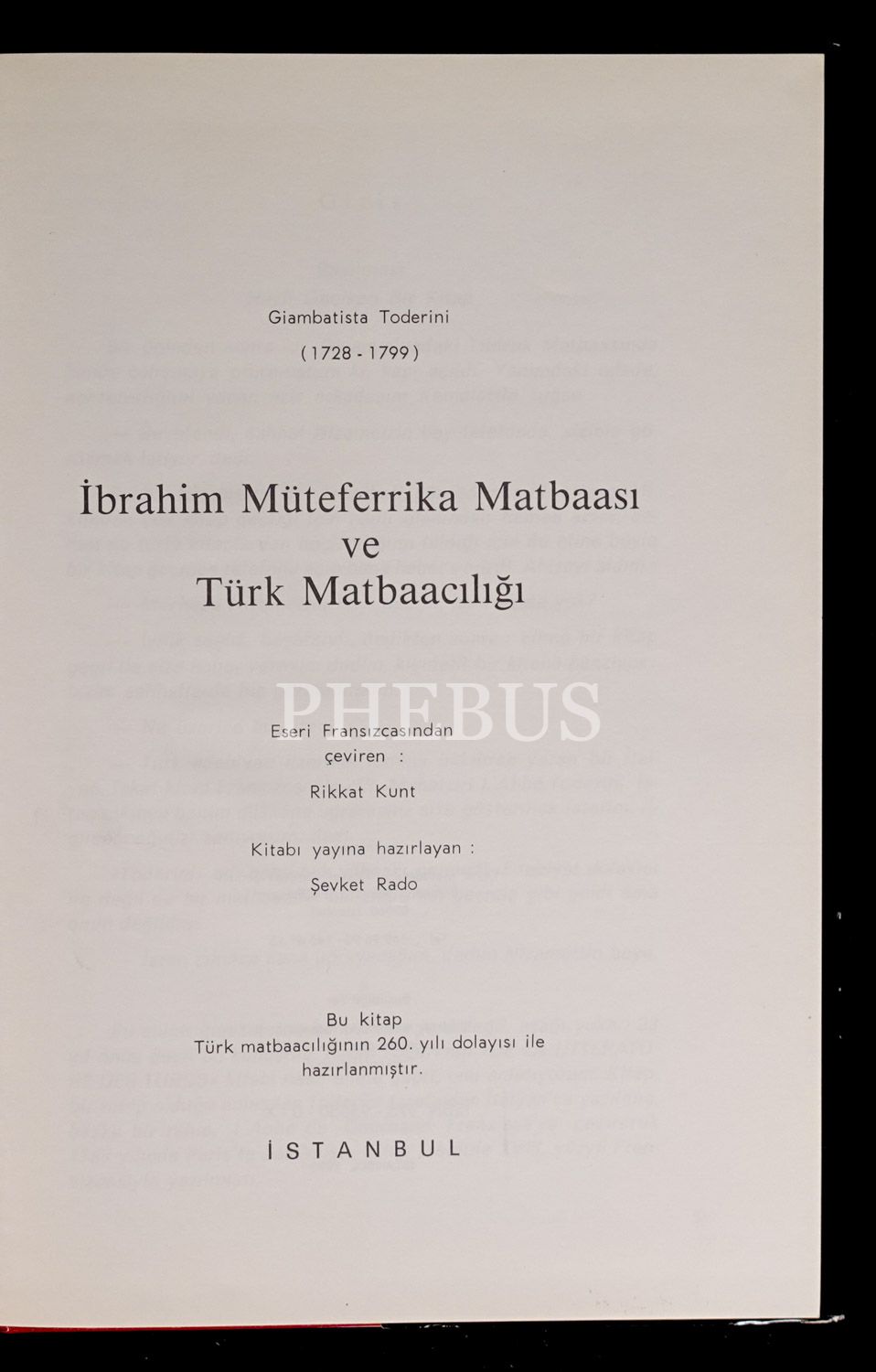 Giambatista Toderi'nin, 1787 yılında yayımladığı, Müteferrika Matbaası hakkında yazılmış ilk eser olma niteliği taşıyan "Letteratura Turchesca" adlı eserinin Şevket Rado tarafından yayımlanan Türkçe ilk basımı...