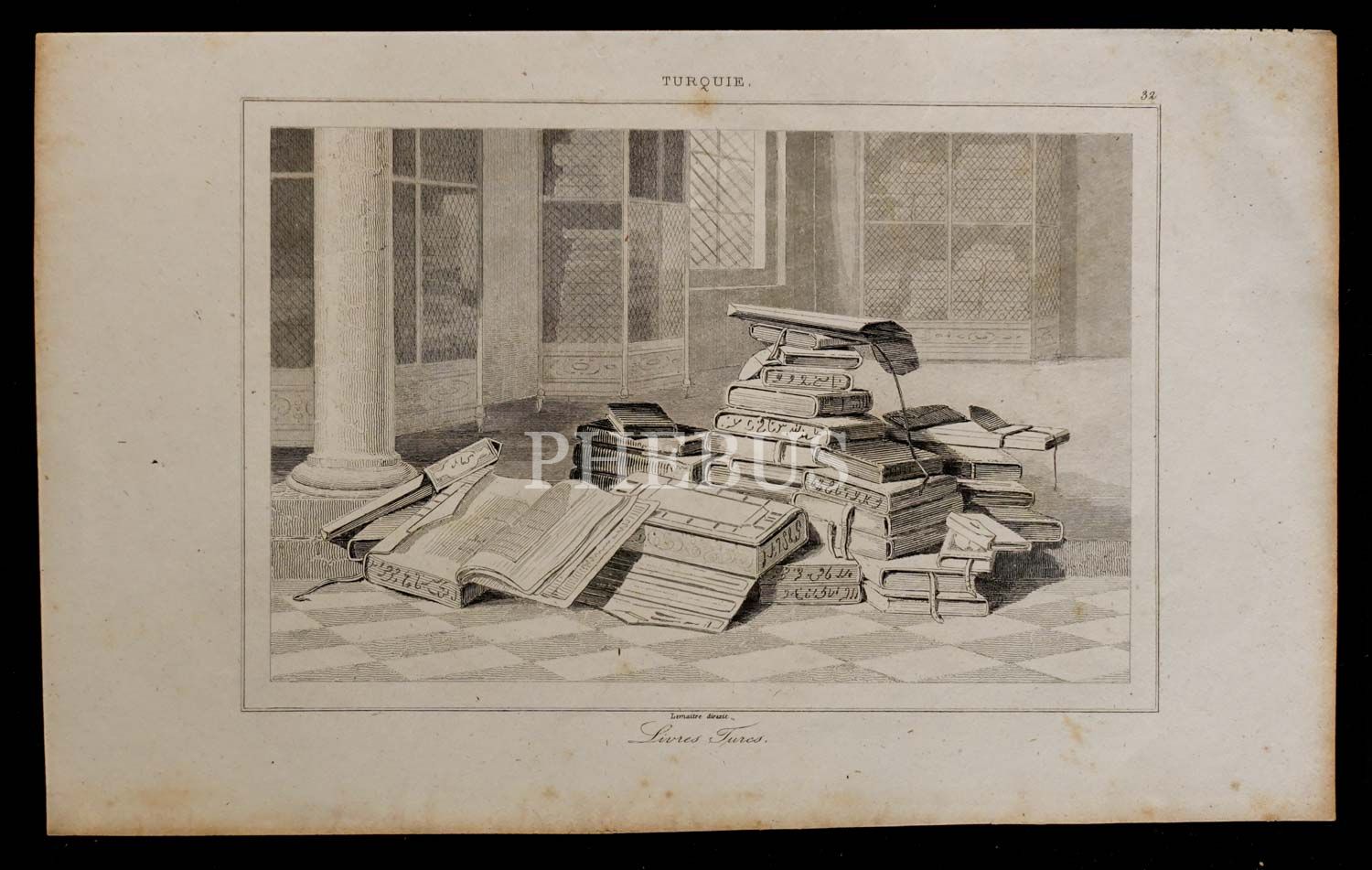 Bir Türk kütüphanesinin içindeki kitap yığınını gösteren, Joseph-Marie Jouannin'in 1840 basımlı "Turquie" adlı kitabından alınmış gravür, 21x13 cm...