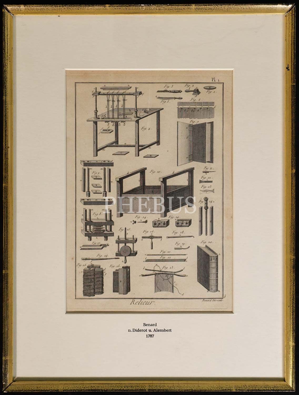 Diderot & D'alambert'in 1751 - 1787 yılları arasında yayımladıkları ünlü "Encyclopedié"nin (Ansiklopedi veya Bilimler, Sanatlar ve Zanaatlerin Sistematik Sözlüğü), kitap yapımıyla ilgili bölümünden çıkma, mücellit araç ve gereçleri konulu, orijinal gravürü, 1787, 32x42 cm...