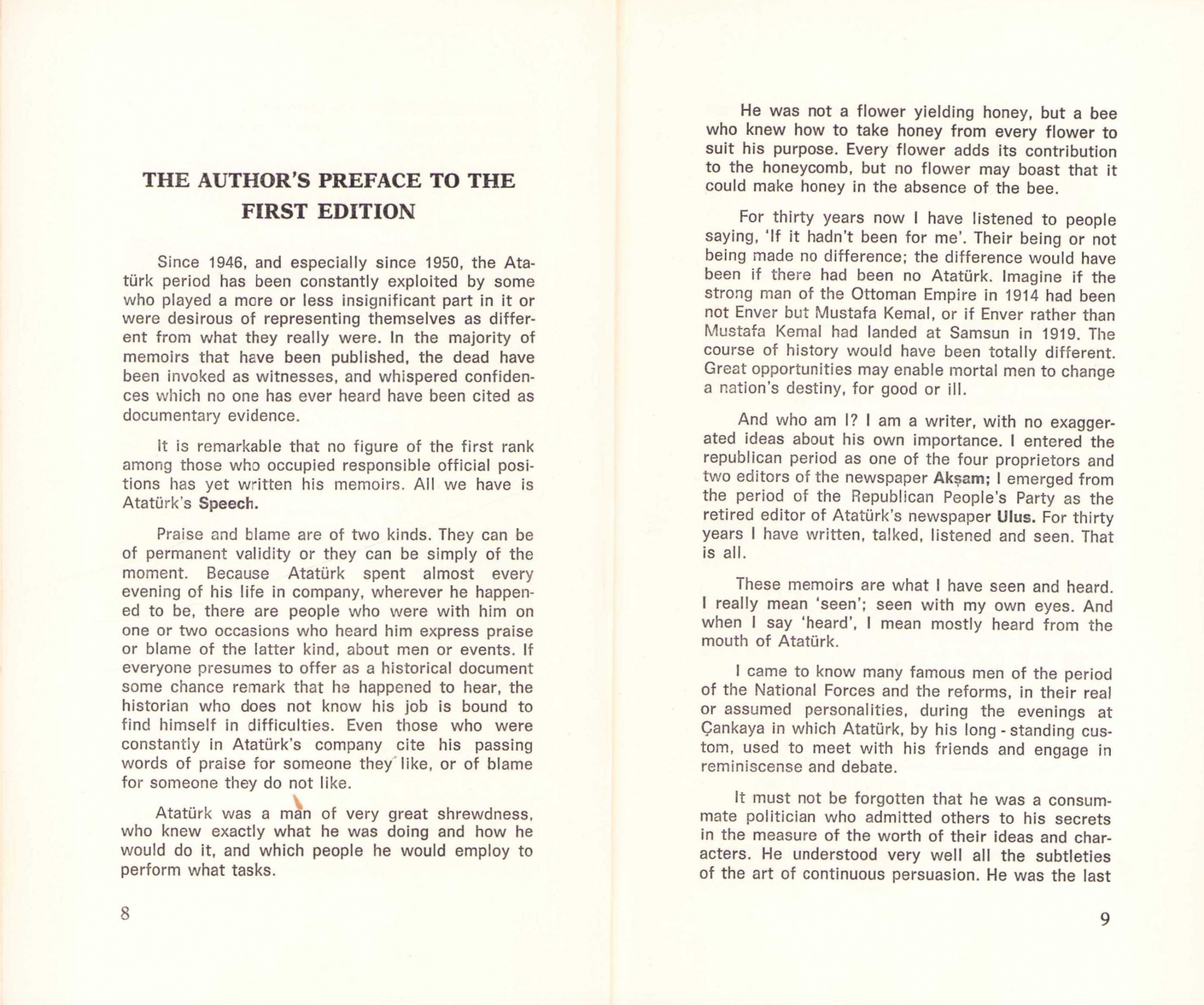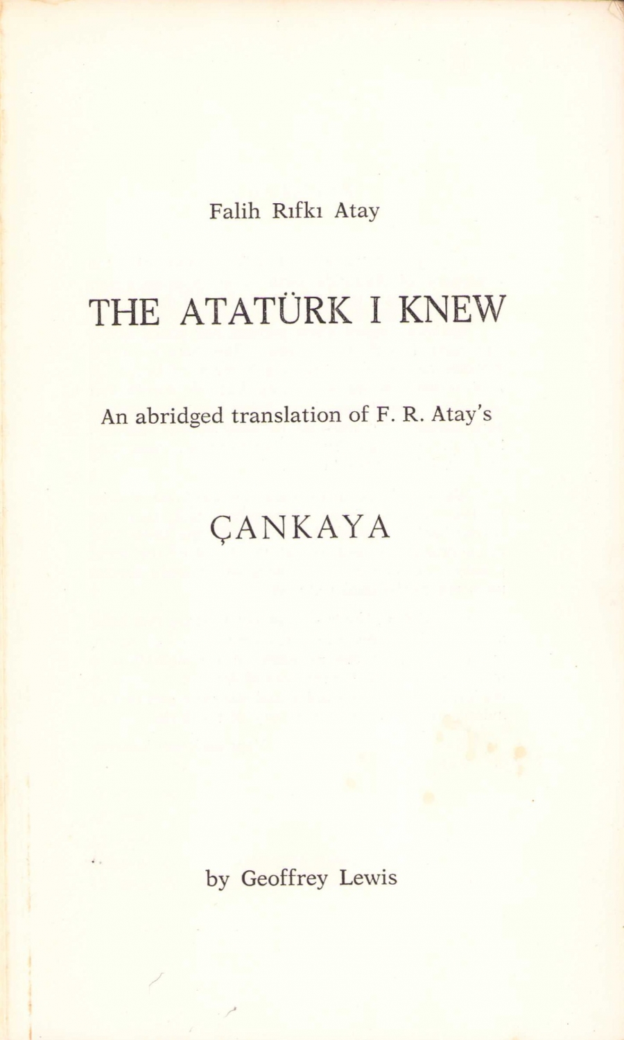 F.R. Atay'ın Çankaya'sının Kısaltılmış Tercümesi "The Atatürk I Knew", çev., Geoffrey Lewis, Atatürk'ün Doğumunun 100. yılı soğuk damgalı, İstanbul, 1981, 193 sayfa, 14x20 cm