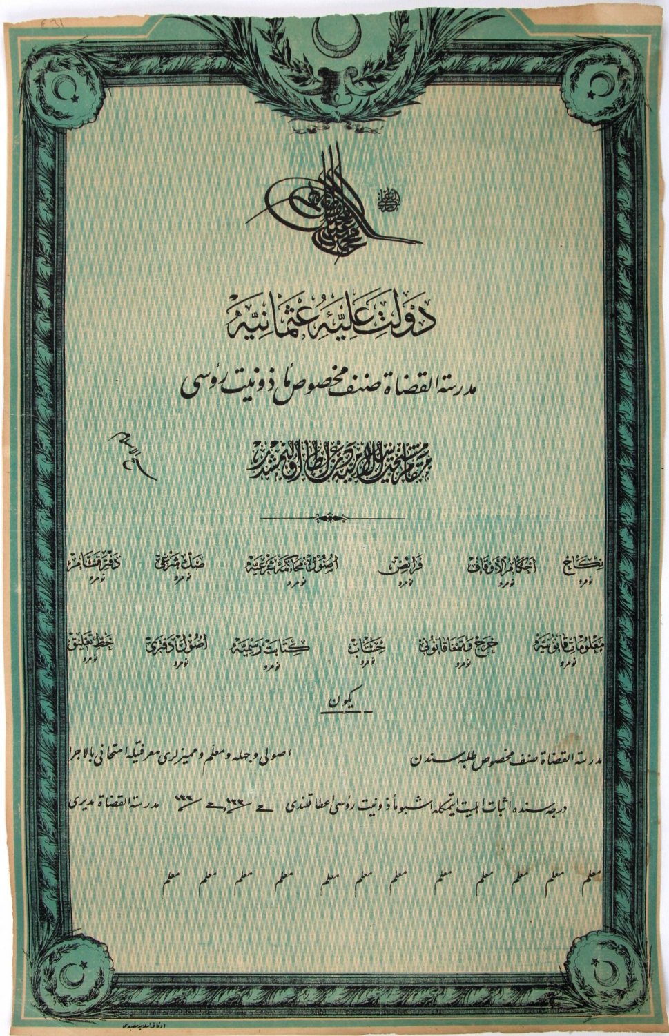 Devlet-i Aliyye-yi Osmaniye Medresetü'l Kudat Sınıf-ı Mahsus Mezuniyet Diploması, filigranlı, haliyle, 30x46,5 cm.