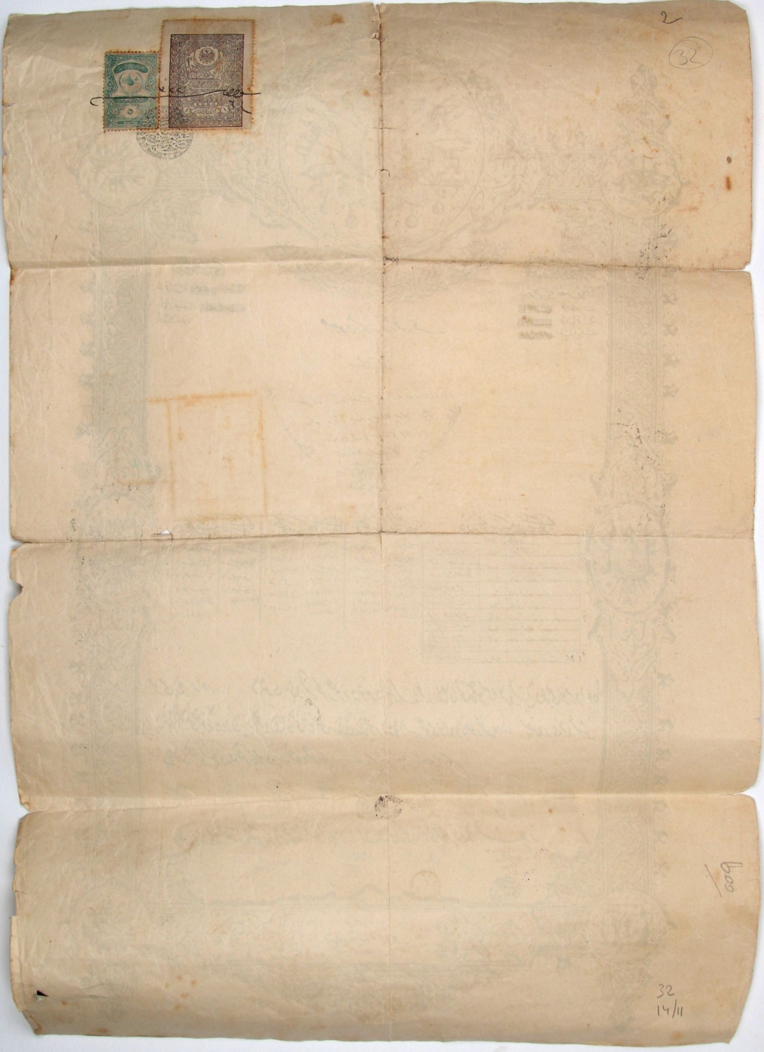 Mekatib-i Rüşdiye-yi Askeriye Şehadetnamesi, Daire-i İstanbul Şehzadebaşı'nda sakin Askeriye Müdürü Mirliva İsmail Paşa'nın oğlu Ref'et Efendi'ye ait, 1302 tarihli, damgalı ve pullu, 34x50 cm.