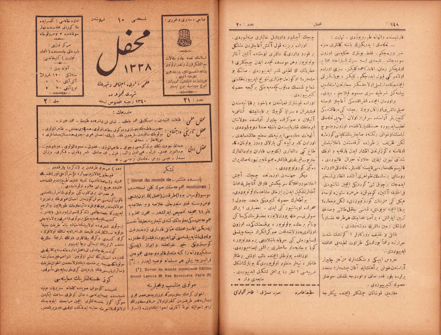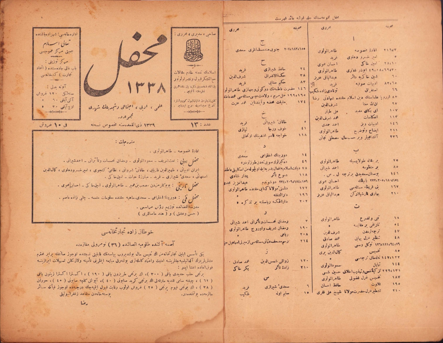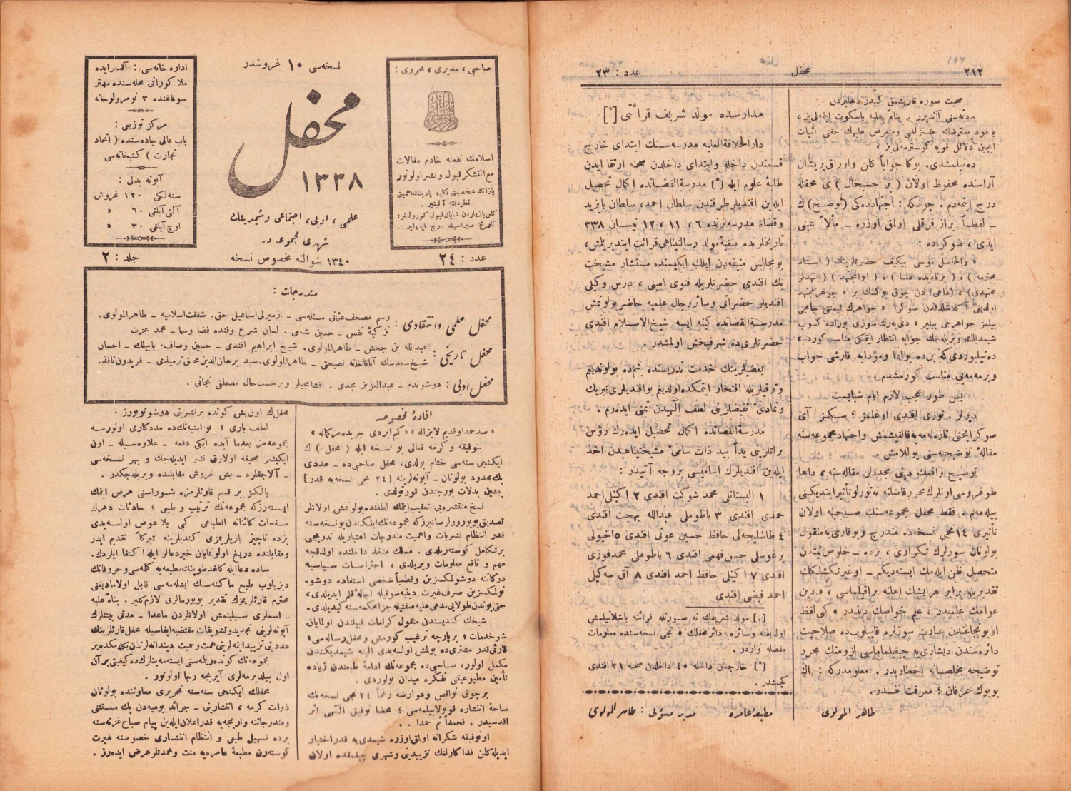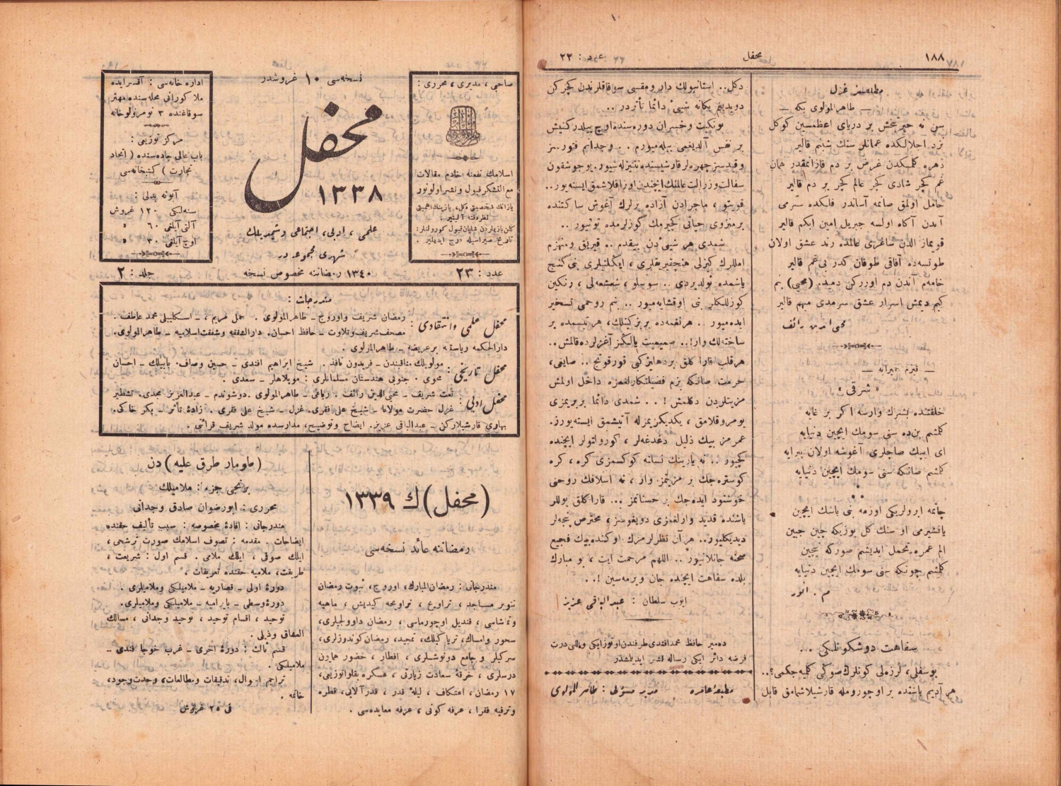 Mahfil Mecmuası: Dini, ilmi, edebi, içtimai mecmua-i İslamiyye, Osmanlıca, 13.-24. sayılar, 1338 tarihli, Sahibi, Müdürü, Muharriri: Tahirü'l Mevlevi, 19,5x28,5 cm.