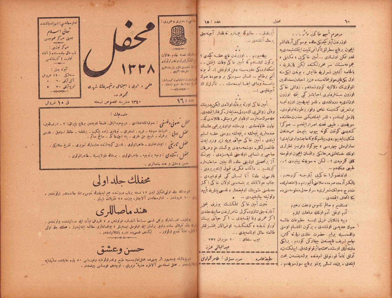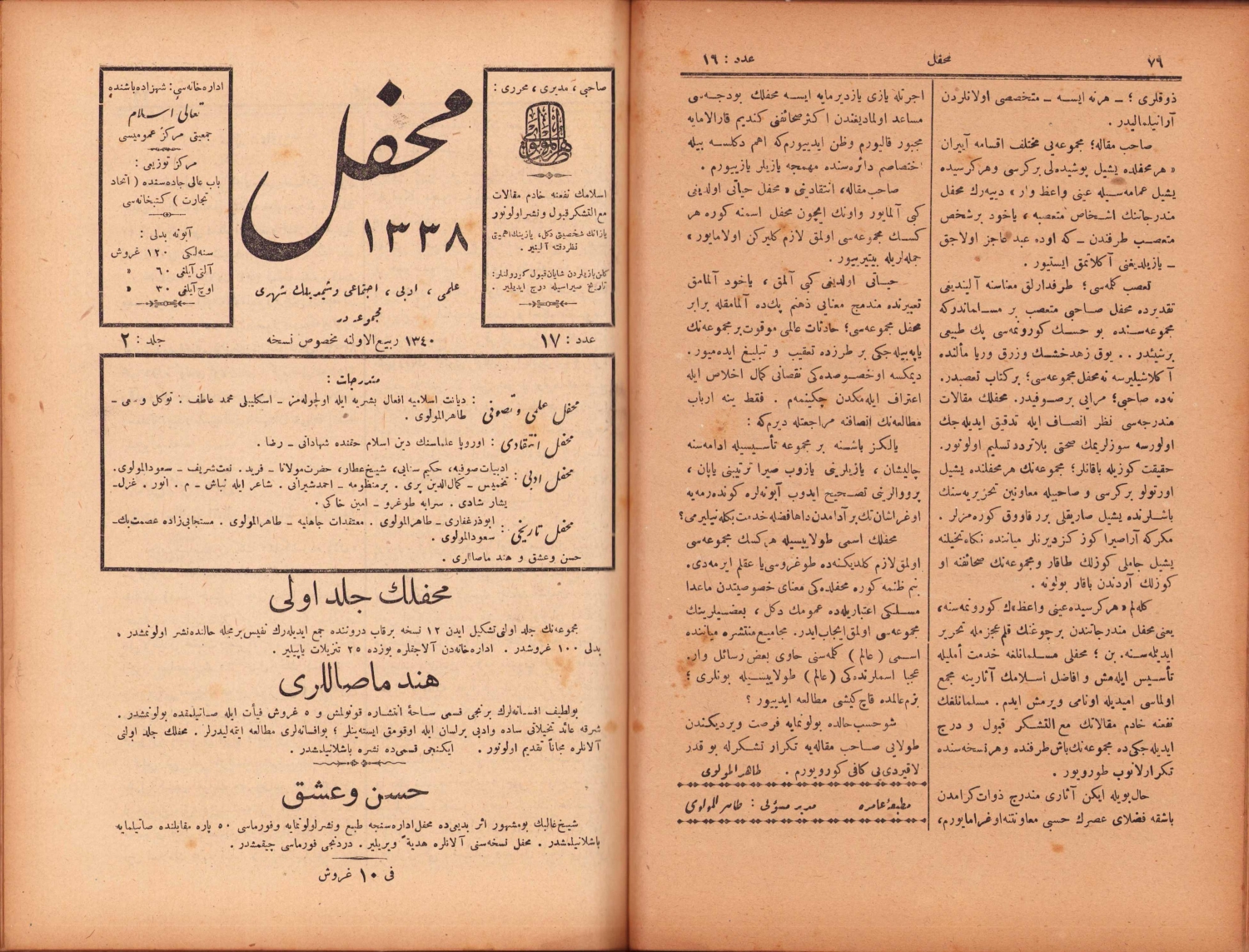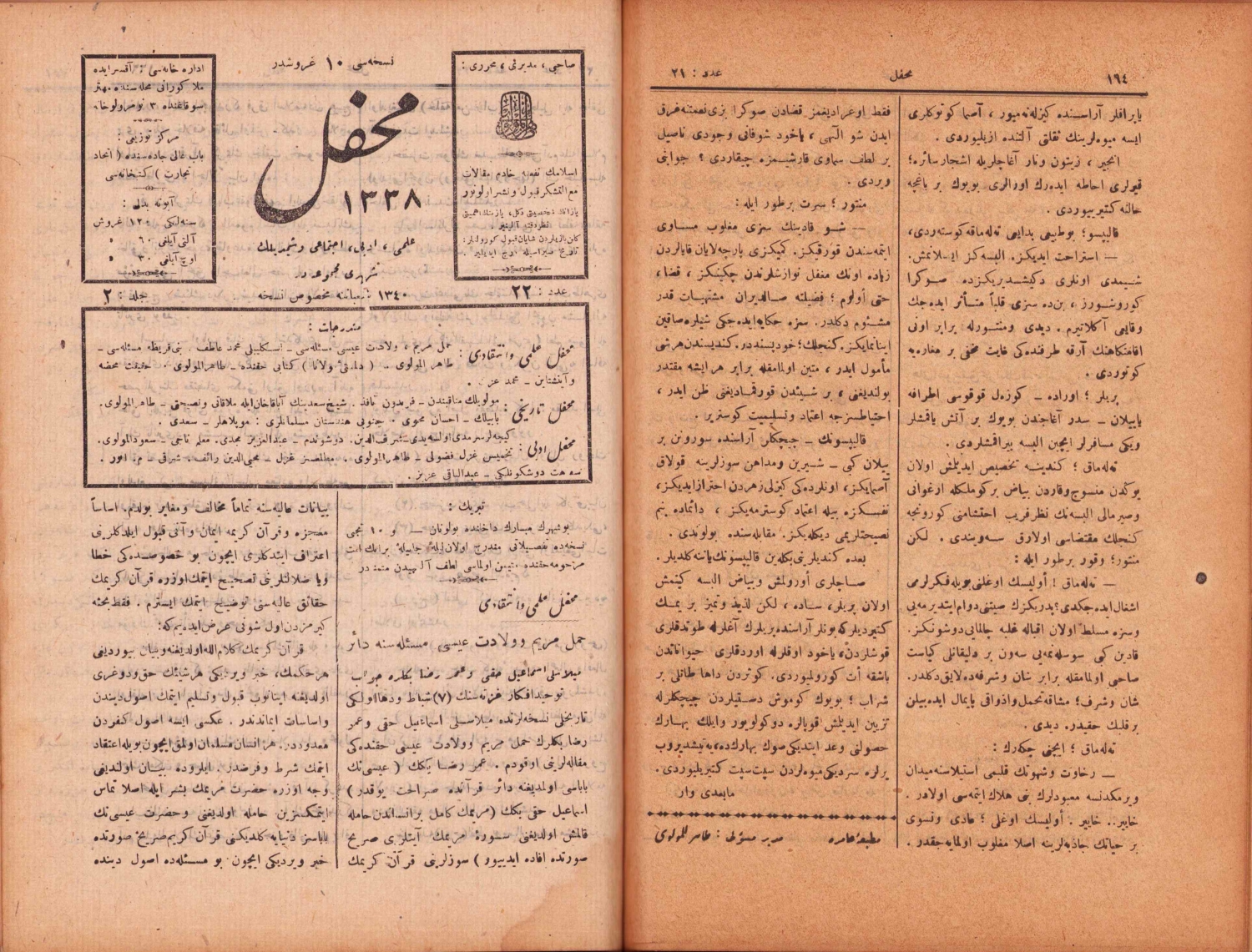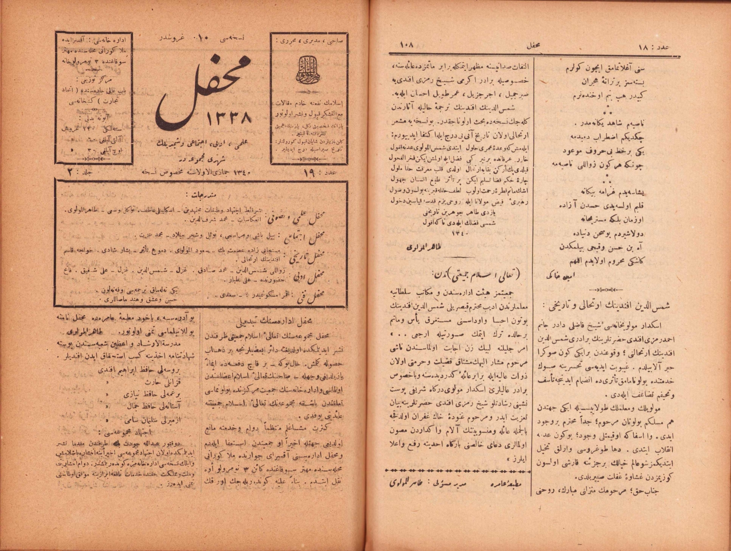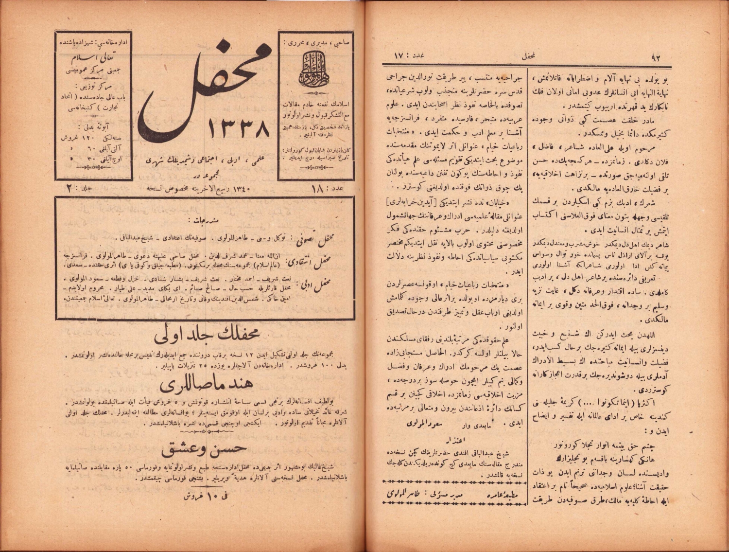 Mahfil Mecmuası: Dini, ilmi, edebi, içtimai mecmua-i İslamiyye, Osmanlıca, 13.-24. sayılar, 1338 tarihli, Sahibi, Müdürü, Muharriri: Tahirü'l Mevlevi, 19,5x28,5 cm.