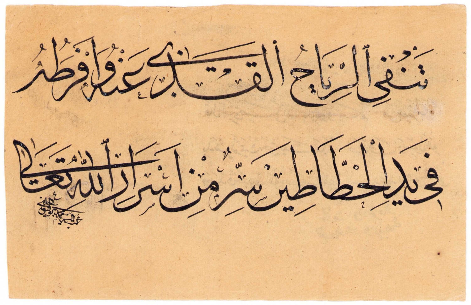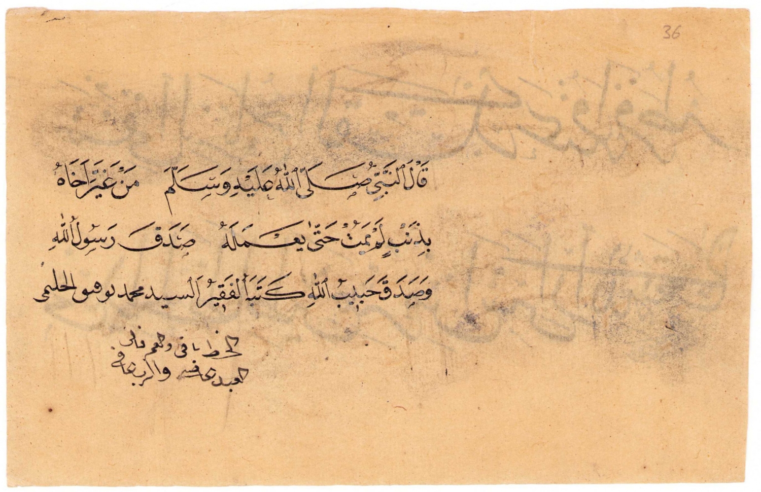 Sülüs yazı, ketebe Mehmed Tevfik Hilmi ve arkasında Nesih Hadis-i şerif, Mehmed Tevfik Efendinin terekesine ait, Mehmed Tevfik Hilmi Efendi ketebeli, 22,5x14,5 cm.