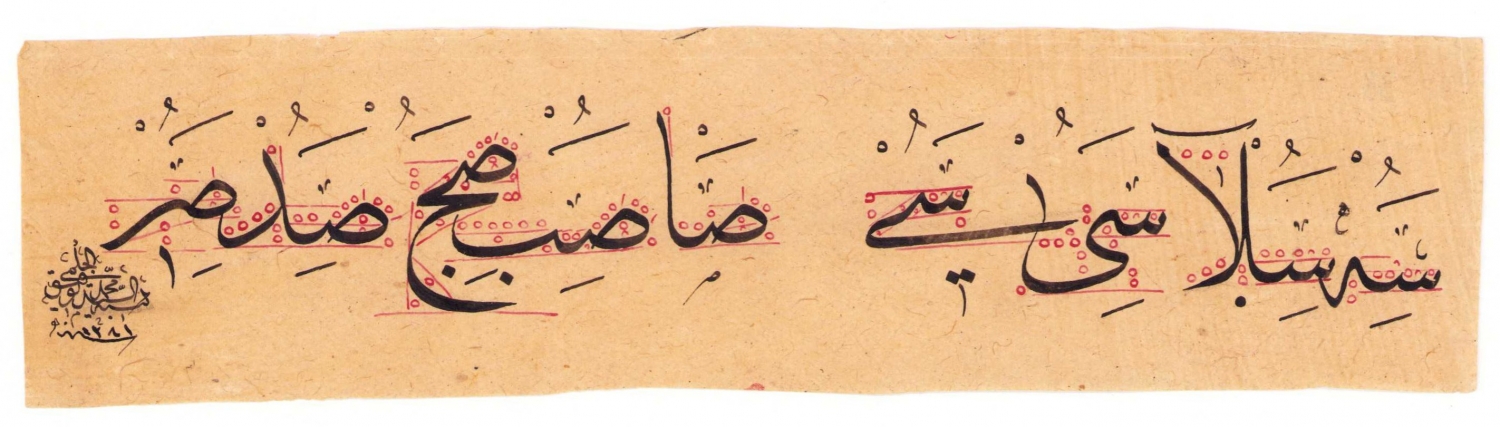 Sülüs hurufat meşki, Mehmed Tevfik Efendinin terekesine ait, Mehmed Tevfik Hilmi Efendi ketebeli, 1281 tarihli, 23,5x6 cm.
