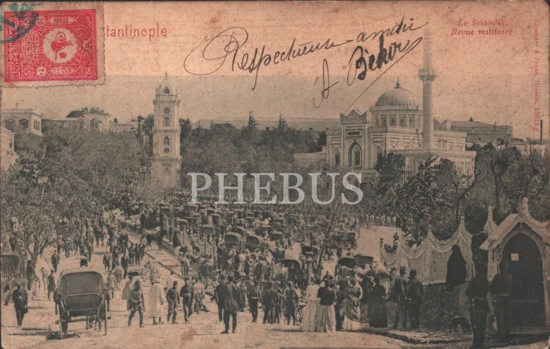 Yıldız Cami´nde bir selamlık merasimi, "Constantinople Le Selamlik. Revue militaire", ed.: Römmler & Jonasi Dresde. 15015 g, pullu ve postadan geçmiş, İstanbul, 14x9 cm...