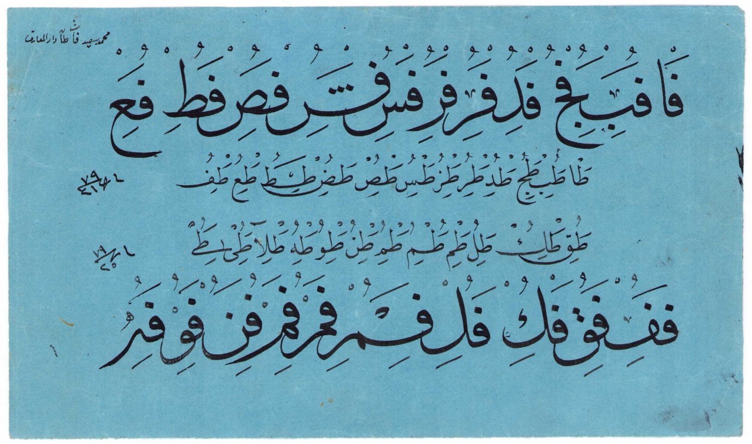 Sülüs Nesih hurufat meşki, Mehmed Tevfik Efendinin terekesine ait, 23x13,5 cm.
