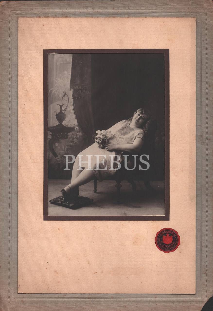 Elinde çiçekler ile poz veren hanımefendinin stüdyo hatıra kabin fotoğrafı, Photographie D. Joseph Constantinople, İstanbul, 20x29 cm...