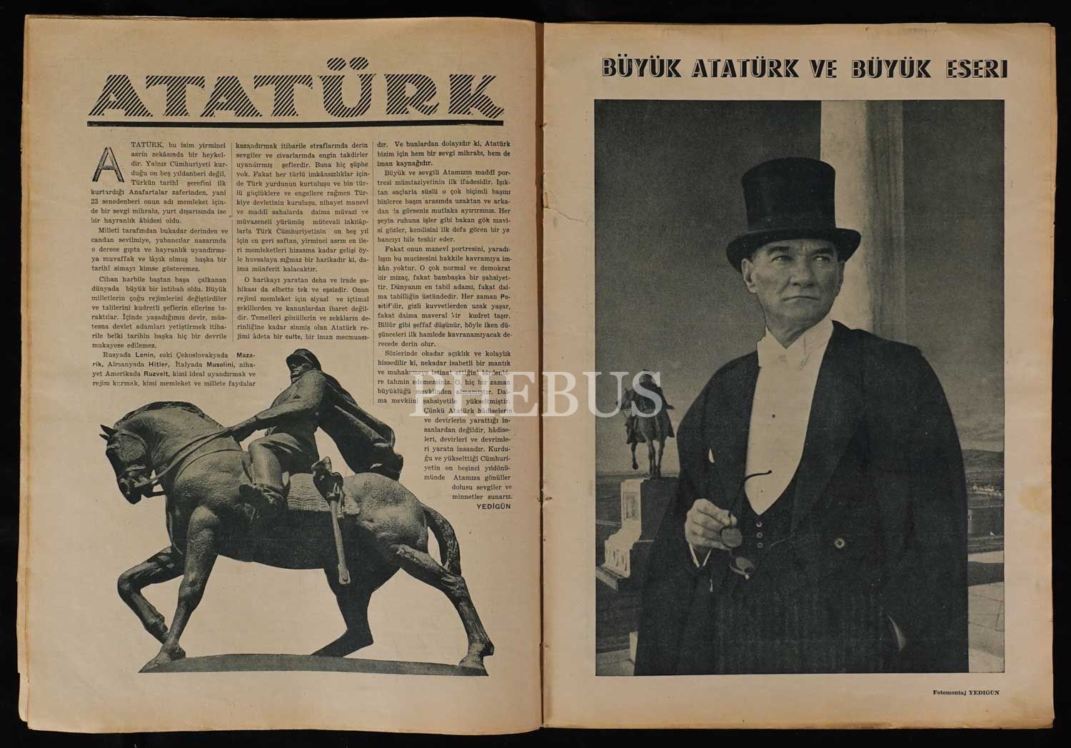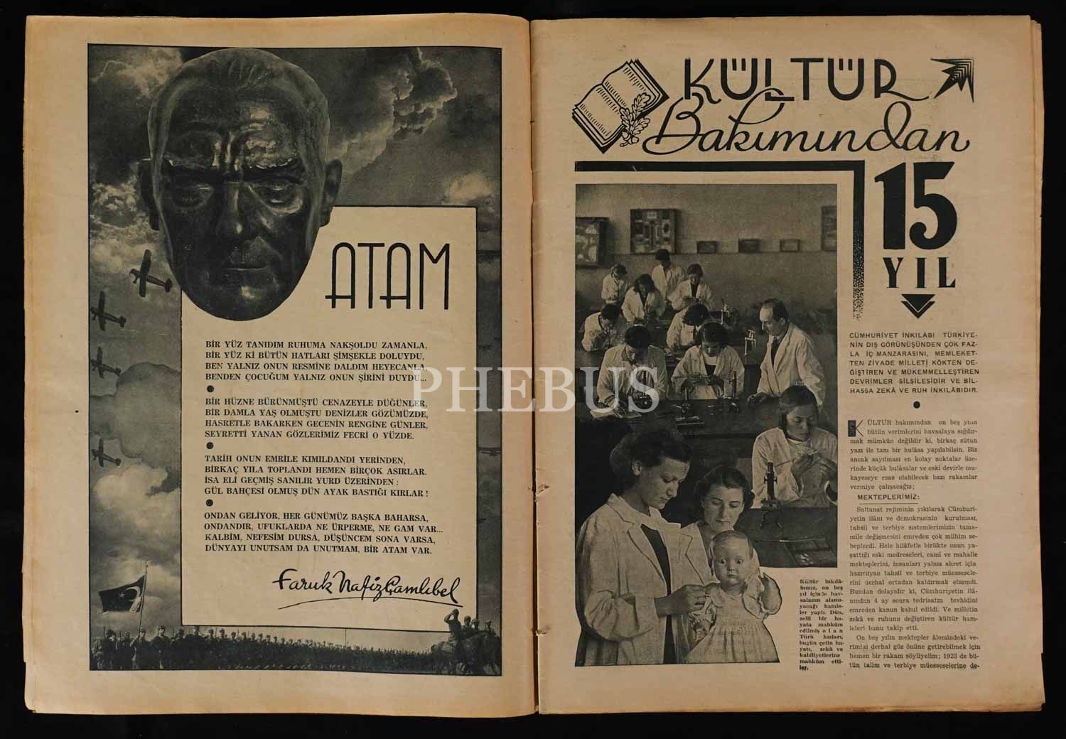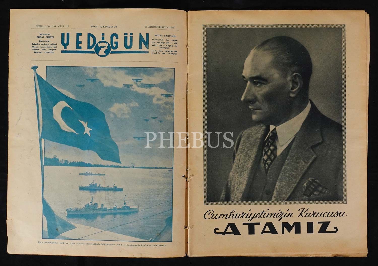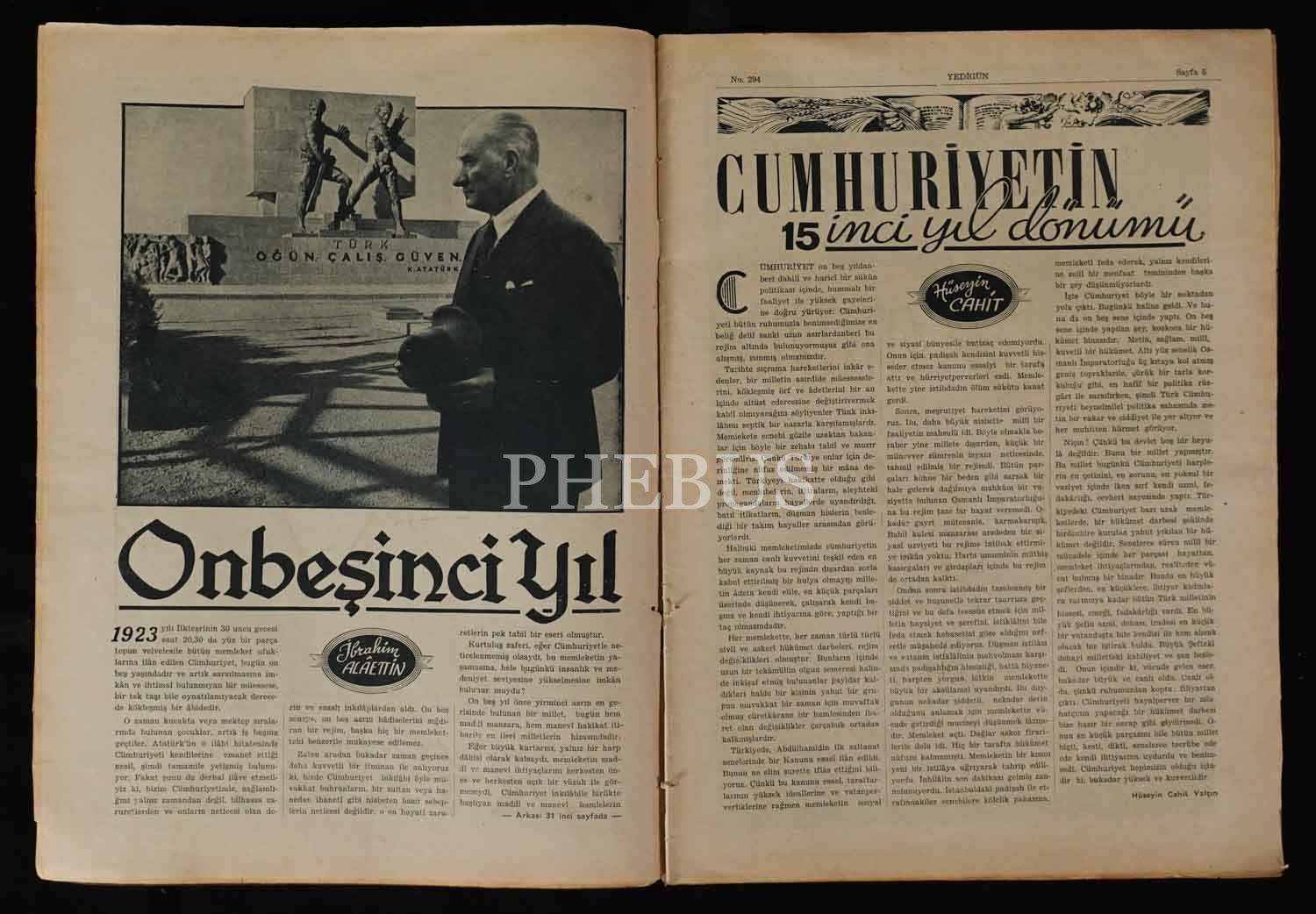 "Münif Fehim" imzalı kapak çizimiyle Cumhuriyet´in 15. Yılı´na özel çıkarılan Yedigün (7 Gün) dergisi, 23 Birinciteşrin 1938 (No. 294), 34 sayfa, 25x34 cm...
