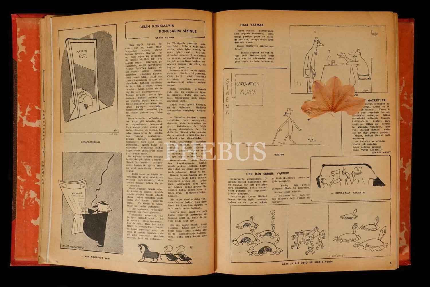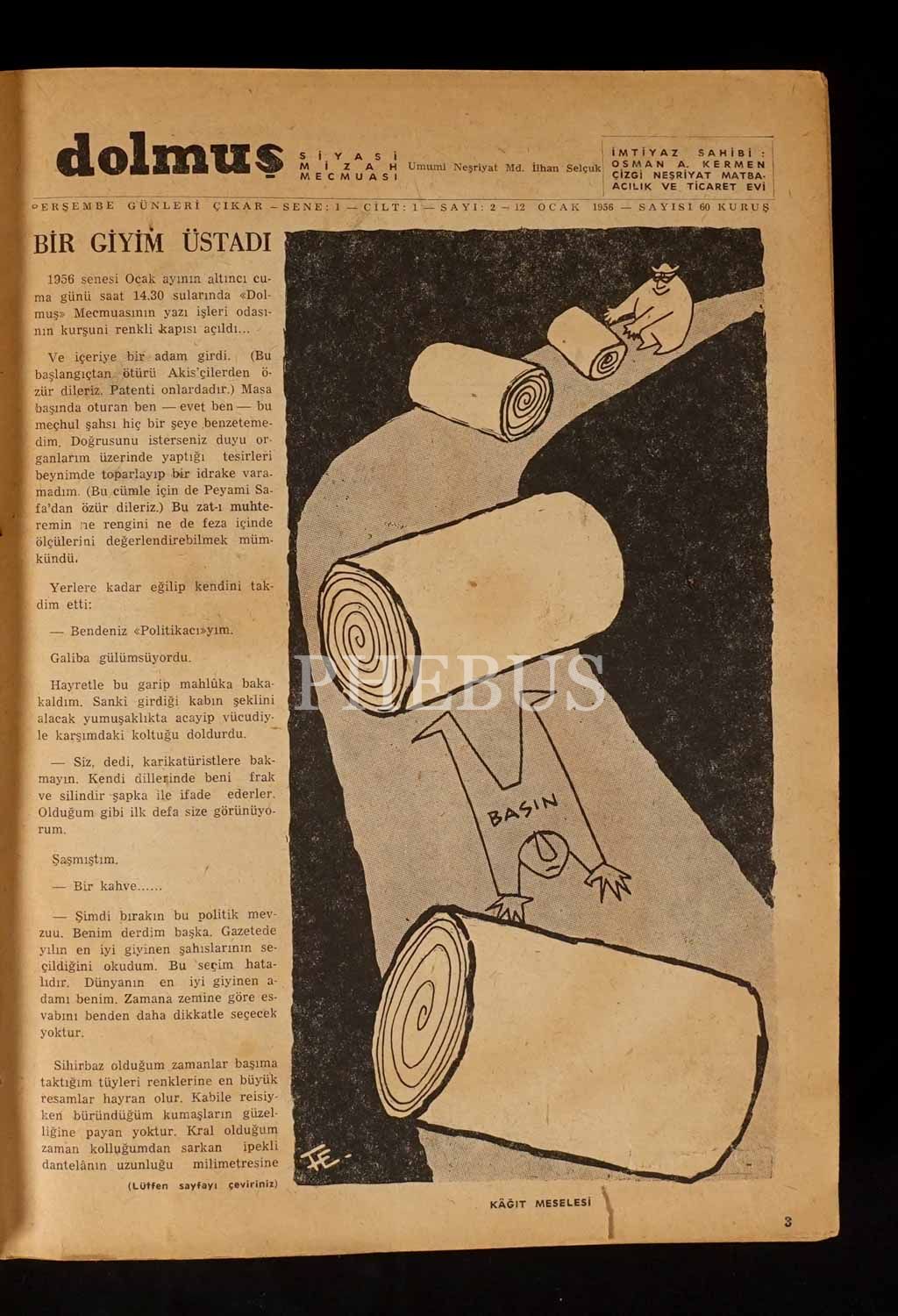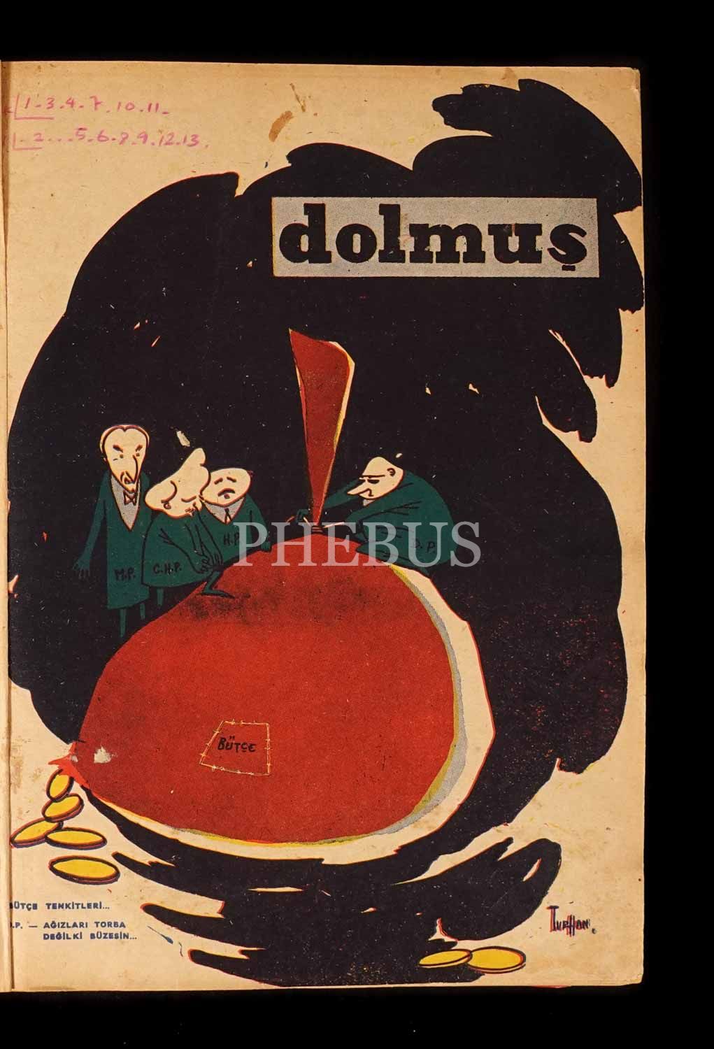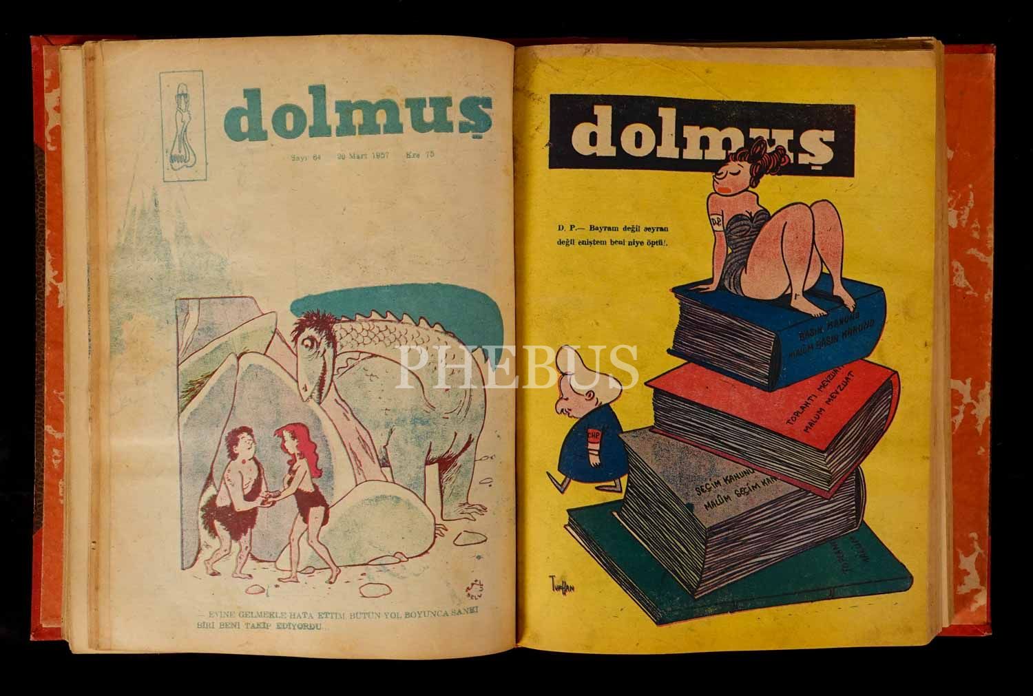 "Siyasi Mizah Mecmuası" DOLMUŞ´un 1956 ilâ 1957 yılları arasında yayınlanan karışık sayılarını ihtiva eden cilt, 20x28 cm...