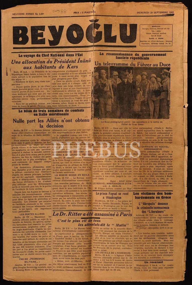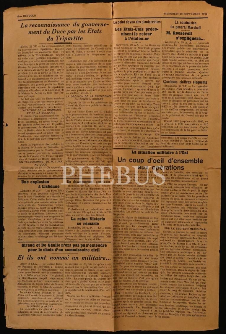 29 Eylül 1943 tarihli, İstanbul´da çıkan Fransızca Beyoğlu gazetesi, 4 sayfa, 32x47 cm...