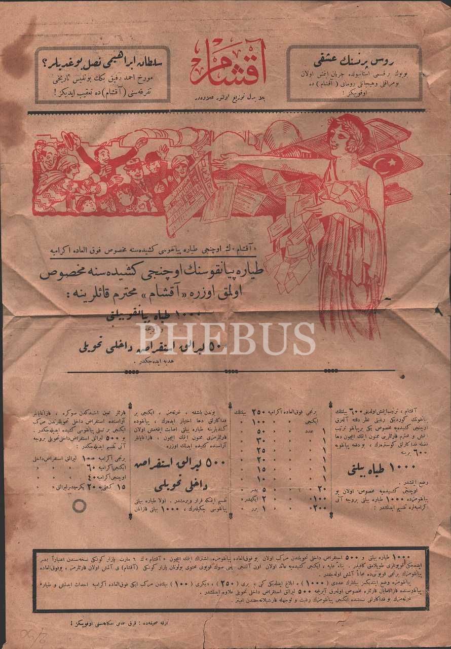 Akşam gazetesinin "Teyyare Piyangosu" dağıtan Osmanlıca ilavesi, 1 sayfa, 30x40 cm...