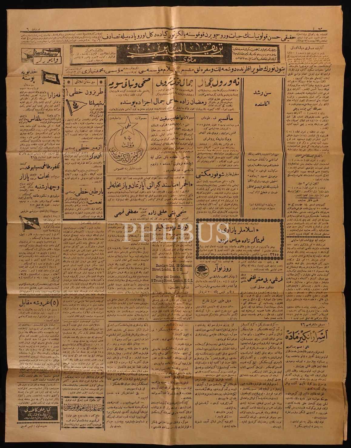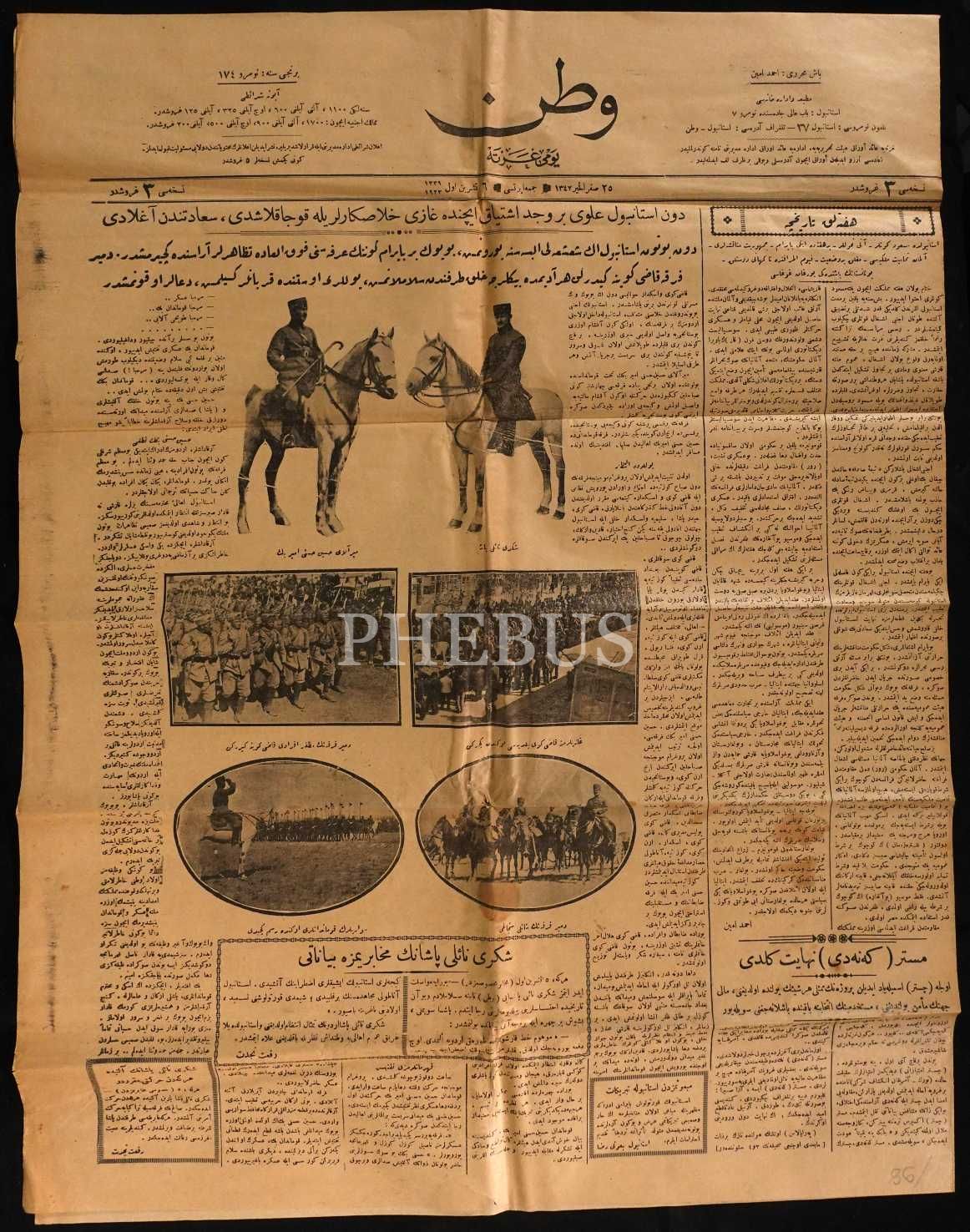 2 Teşrinievvel 1339 tarihli "Dün İstanbul ulvi bir vücud-u iştiyak içinde gazi halaskarlarıyla kucaklaşdı, saadetten ağladı" manşetiyle İstanbul´un düşman işgalinden kurtuluşunu müjdeleyen Vatan gazetesi, 4 sayfa, 48x60 cm...