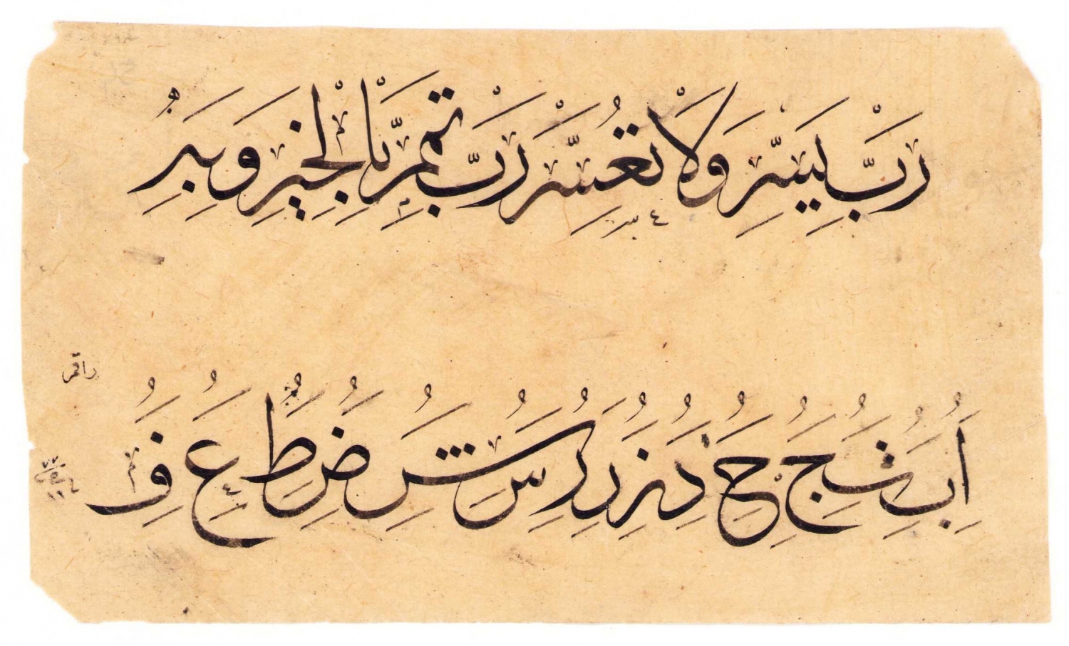 Sülüs 'Rabbi yessir' ve hurufat meşki, Rakım ketebeli, 10,5x18 cm.