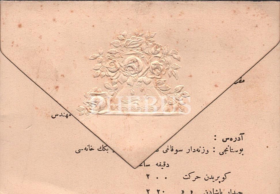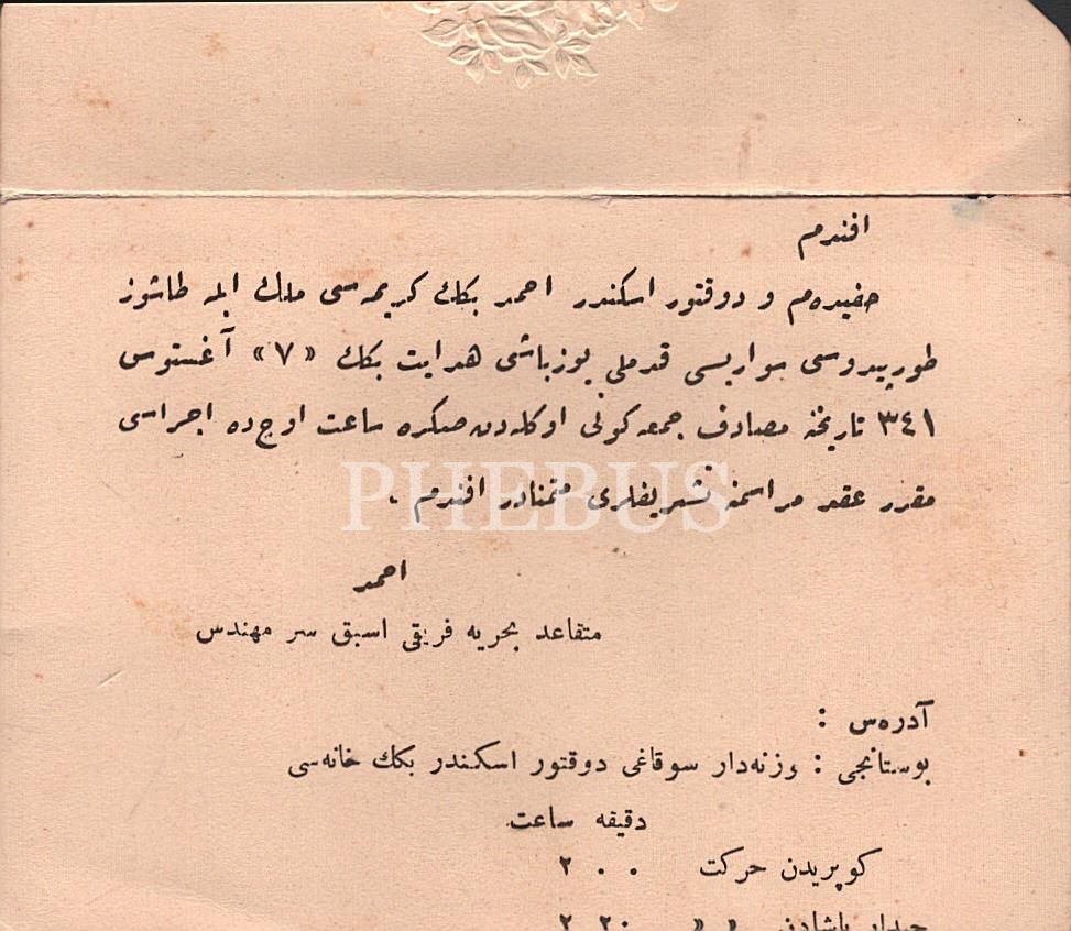 Doktor İskender Ahmet Bey kızı Melek Hanım ile Taşöz Torpidosu Süvarisi Kıdemli Yüzbaşı Hidayet Bey´in 7 Ağustos 1341 tarihli düğün davetiyesi, 13x16 cm...