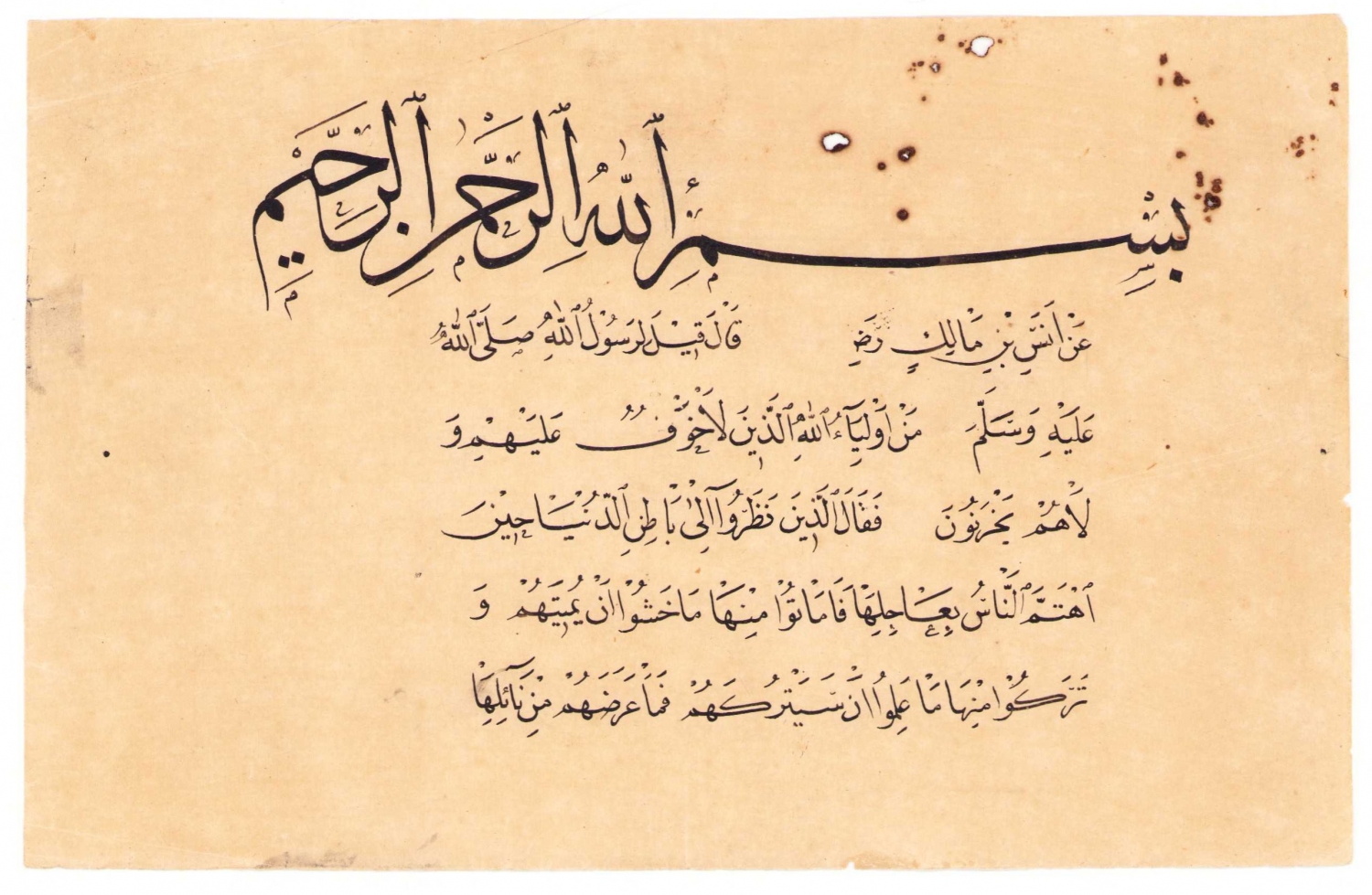 Sülüs 'Besmele' ve Nesih Hadis-i şerif, Mehmed Tevfik Efendinin terekesine ait, 21x13,5 cm.