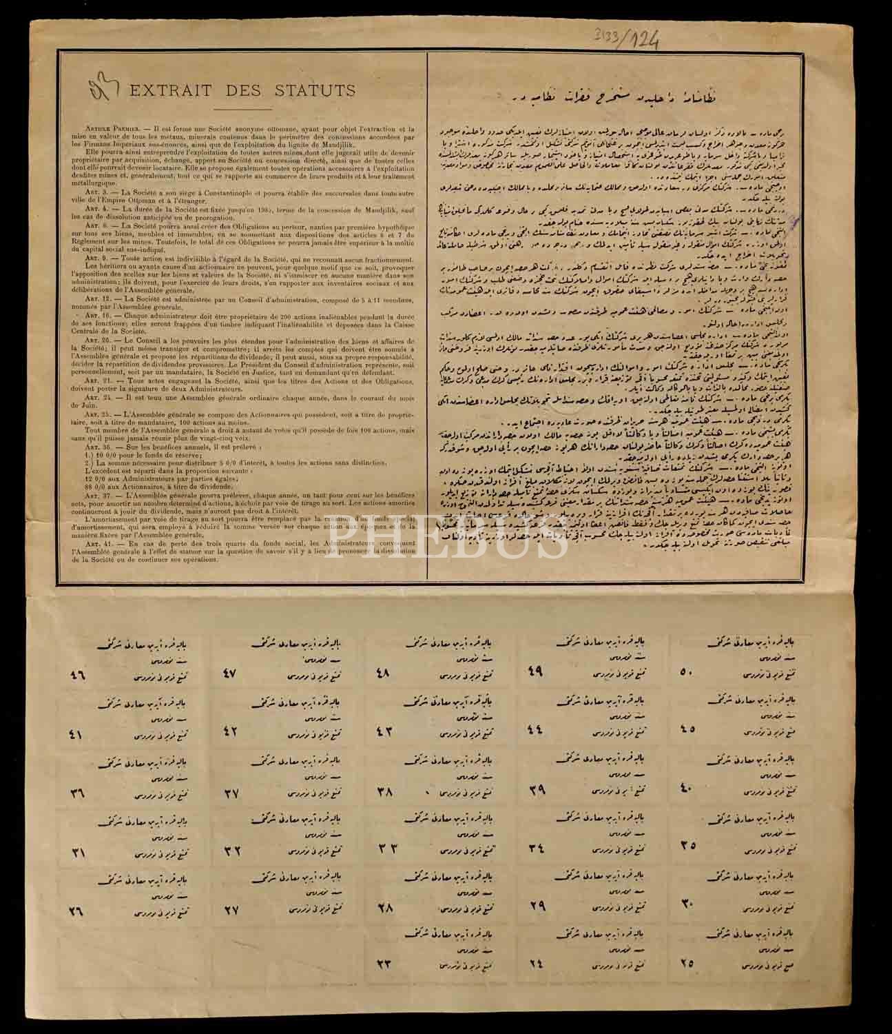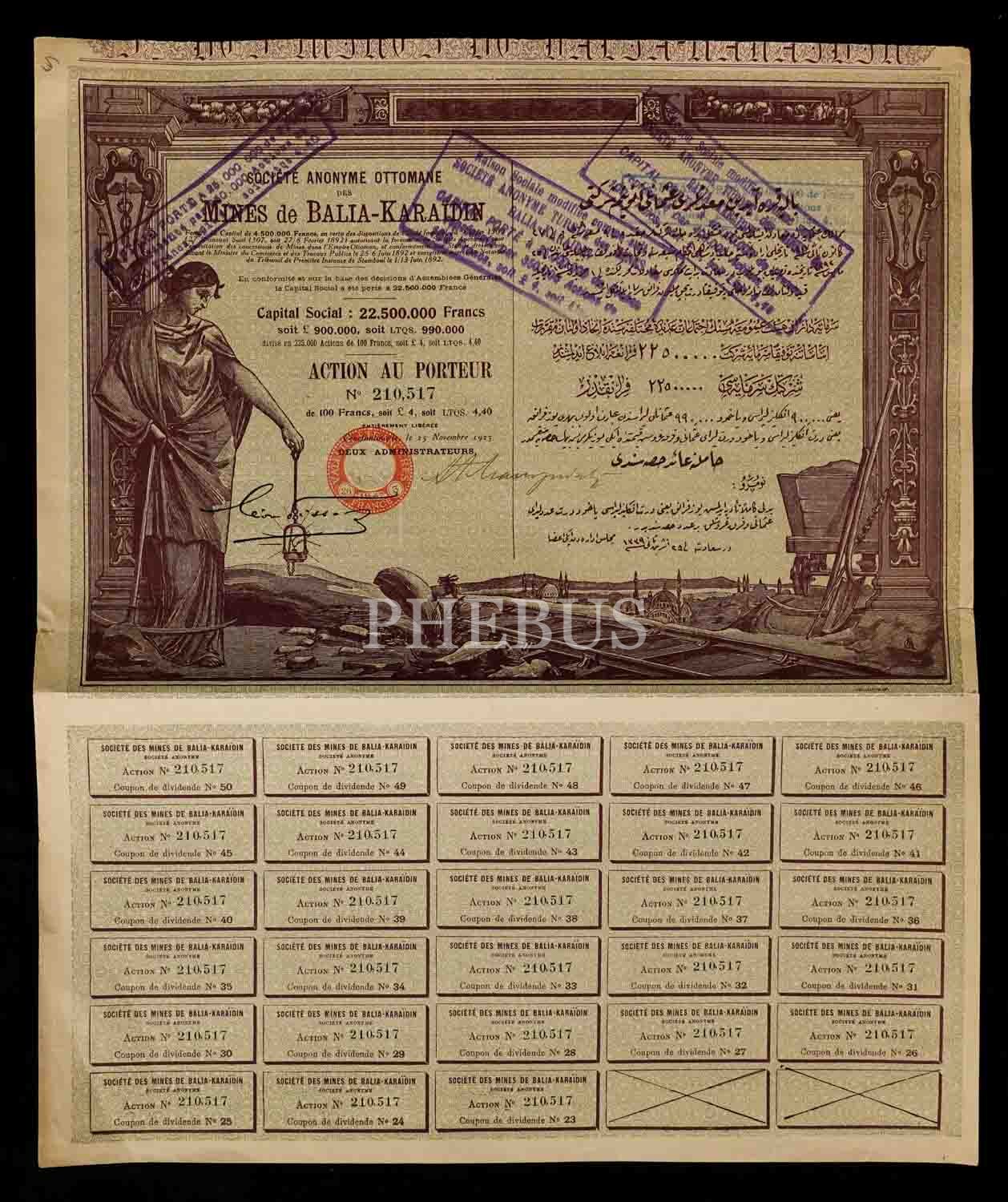 Balya-Karaaydın Madenleri Osmanlı Anonim Şirketi´ne ait hisse senedi, 32x38 cm...