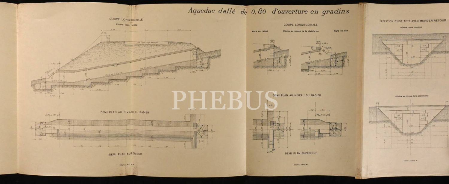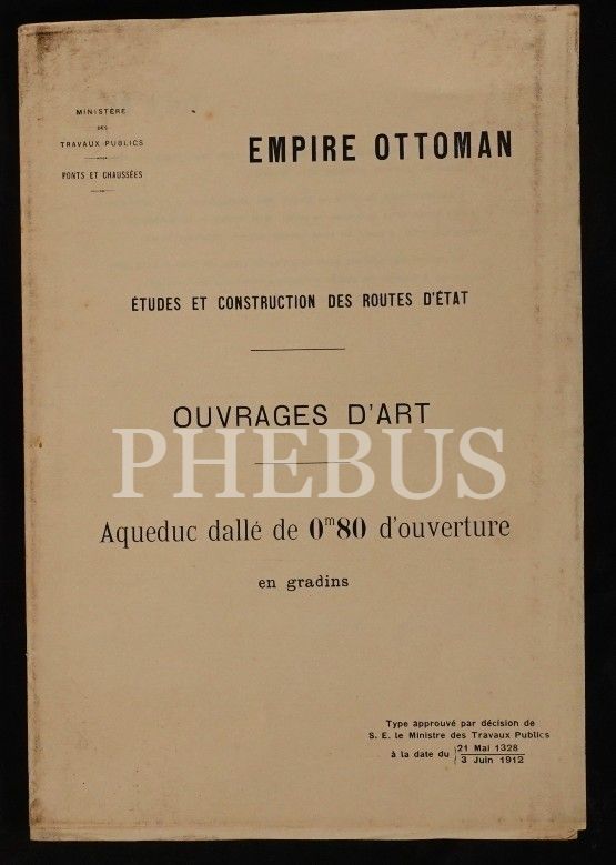 21 Mayıs 1328 tarihli, Osmanlı İmparatorluğu Devlet Kamu İşleri Köprüler ve Yollar Bakanlığı tarafından hazırlanan Fransızca su kemeri planı, "Ministre Des Travaux Publics Ponts Et Chaussees Empire Ottoman", 21x31 cm...