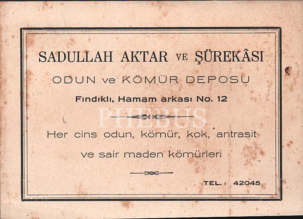İstanbul Beyoğlu Fındıklı adresli Sadullah Aktar ve Şürekâsı Odun ve Kömür Deposu işyeri kartı, 12x9 cm...
