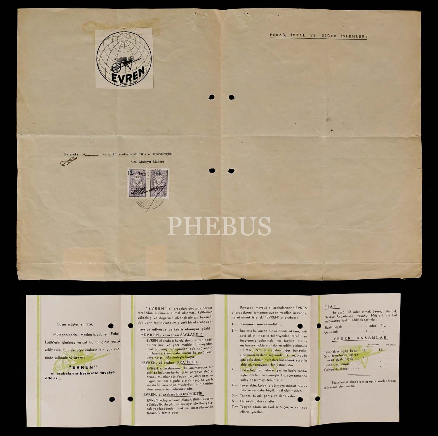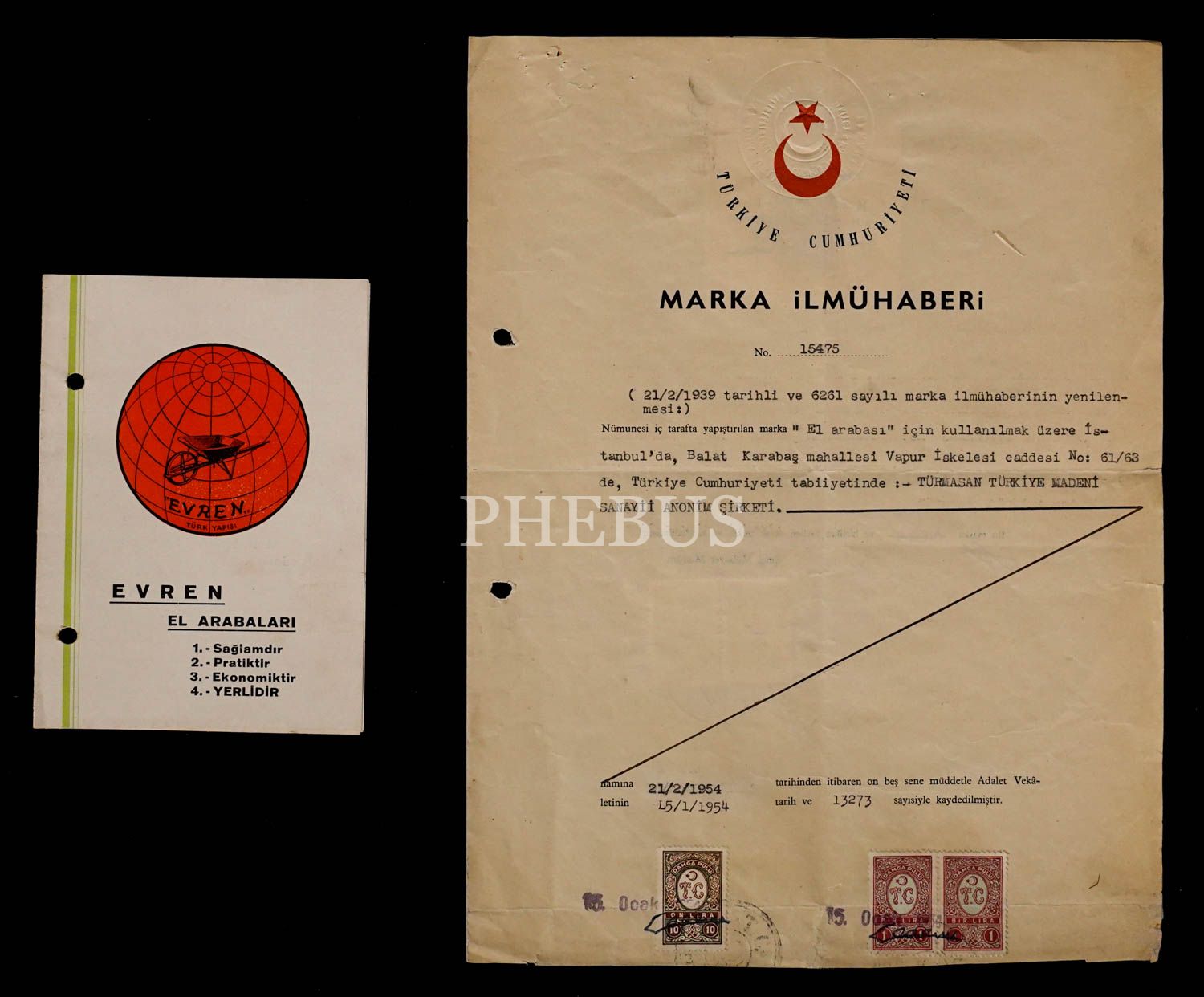 Evren "Türk Yapışı" El Arabaları´nın marka ilmühaberinin yenilenmesine dair 1954 tarihli vesika, 22x30 cm...