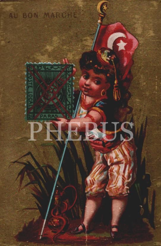 "Au Bon Marche (Bonmarşe) - Paris" reklamlı, şark kıyafetleri içerisinde Türk pulu tutan küçük kız görselli kart, 7x10 cm...