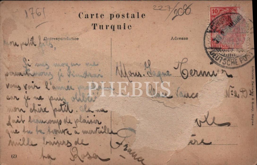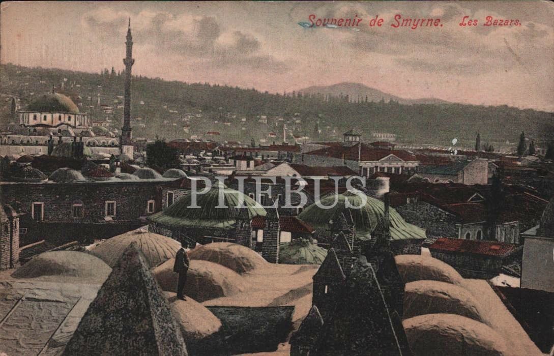 İzmir manzarası, "Souvenir de Smyrne Les Bazars", pullu ve postadan geçmiş, İzmir, 14x9 cm..
