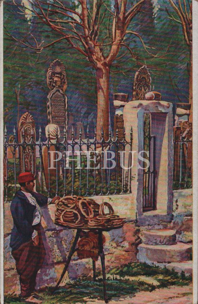 İstanbul´da mezarlık önünde simitçi, "Cimetiere a Stambol, Constantinople", İstanbul, 14x9 cm...