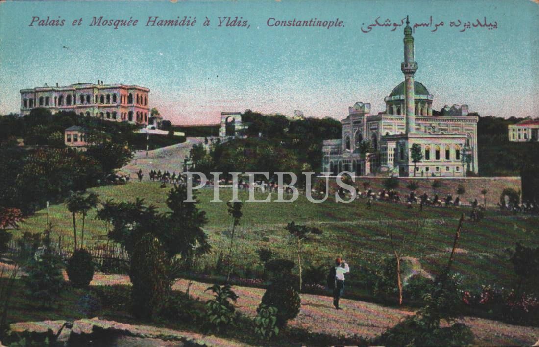 Yıldız Merasim Köşkü ve Yıldız Cami önünde merasim geçiti, "Palais et Mosquée Hamidié a Yldiz, Constatinople",Osmanlıca "Yıldız´da Merasim Köşkü" yazılı, ed.: M. J. C., İstanbul, 14x9 cm...