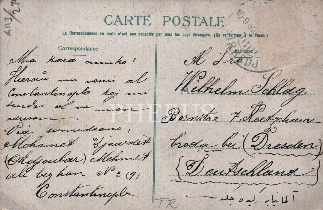 Arka yüzünde, Almanya göderilmiş Almanca mektup yer almaktadır.